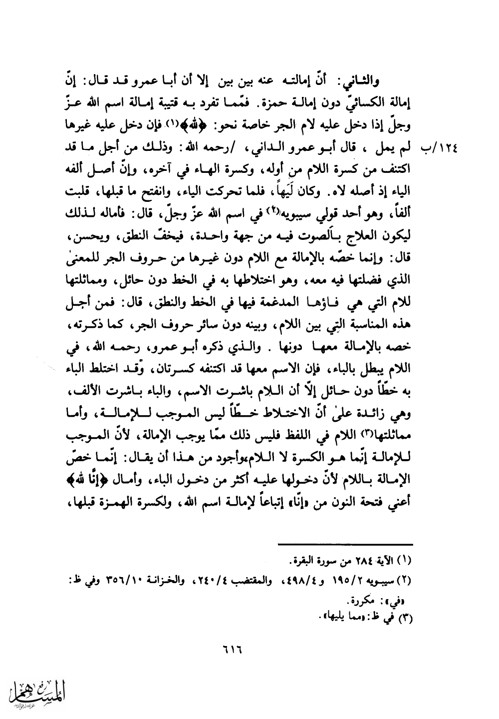 والذي ذكره أبو عمرو، رحمه الله، في اللام يبطل بالباء، فإن الاسم معها قد اكتنفه كسرتان، وقد اختلط الباء به خطاً دون حائل إلَّا أن اللام باشرت الاسم، والباء باشرت الألف.