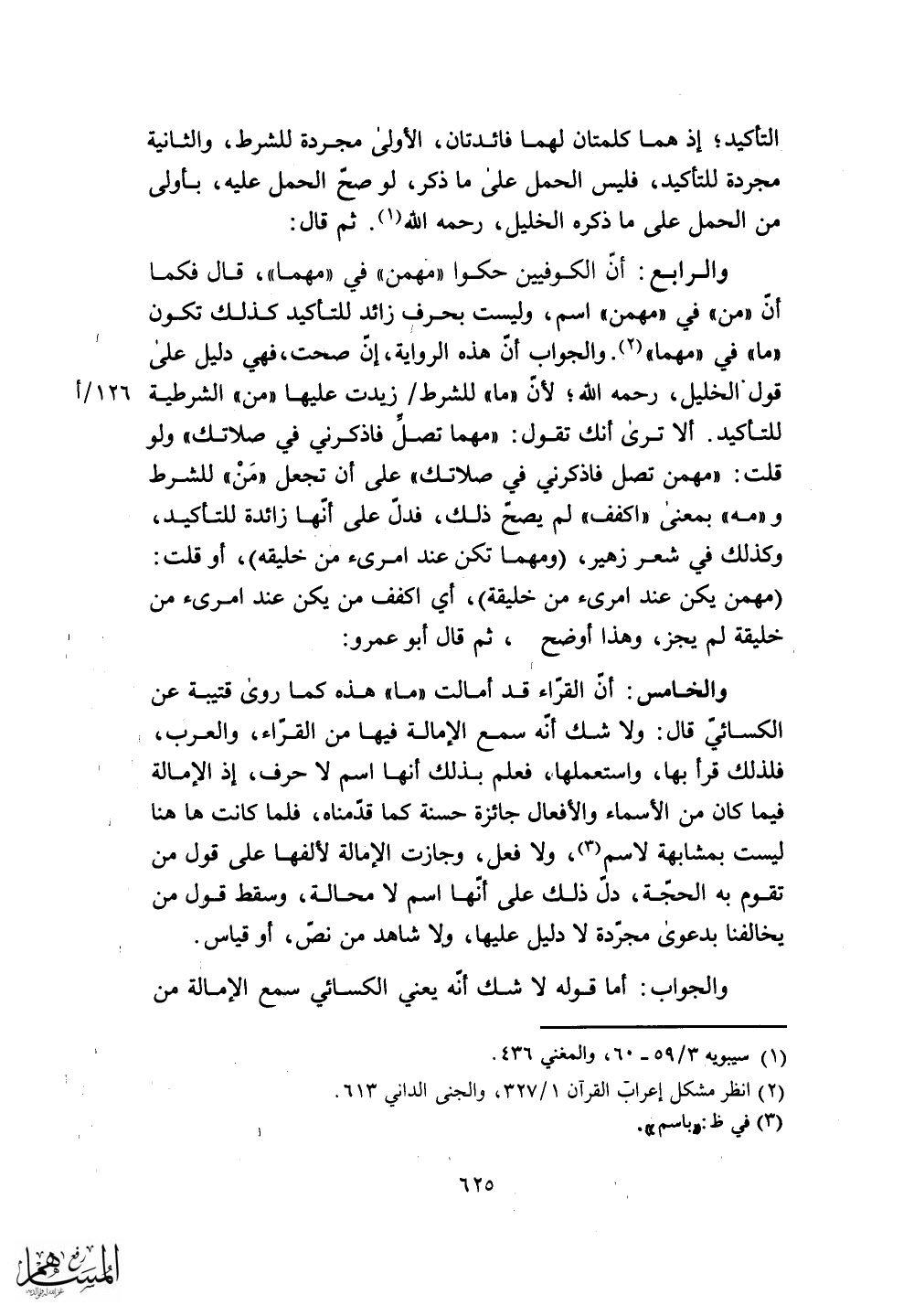 على أن تجعل "مَنْ" للشرط و "مه" بمعنى "اكفف" لم يصح ذلك، فدل على أنها زائدة للتأكيد، وكذلك في شعر زهير، (ومهما تكن عند امرئ من خليقه) ، أو قلت: (مهمن يكن عند امرئ من خليقة) ، أي اكفف من يكن عند امرئ من خليقة لم يجز، وهذا أوضح، ثم قال أبو عمرو: