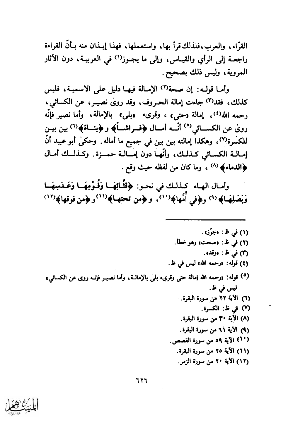 رحمه الله، إمالة (حتي) ، وقرئ "بلى" بالإمالة، وأما نصير فإنه