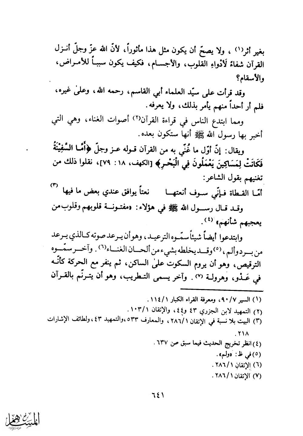 ويقال: إن أول ما غُنَي به من القرآن قوله عزَّ وجلَّ (أَمَّا السَّفِينَةُ فَكَانَتْ لِمَسَاكِينَ يَعْمَلُونَ فِي الْبَحْرِ) .