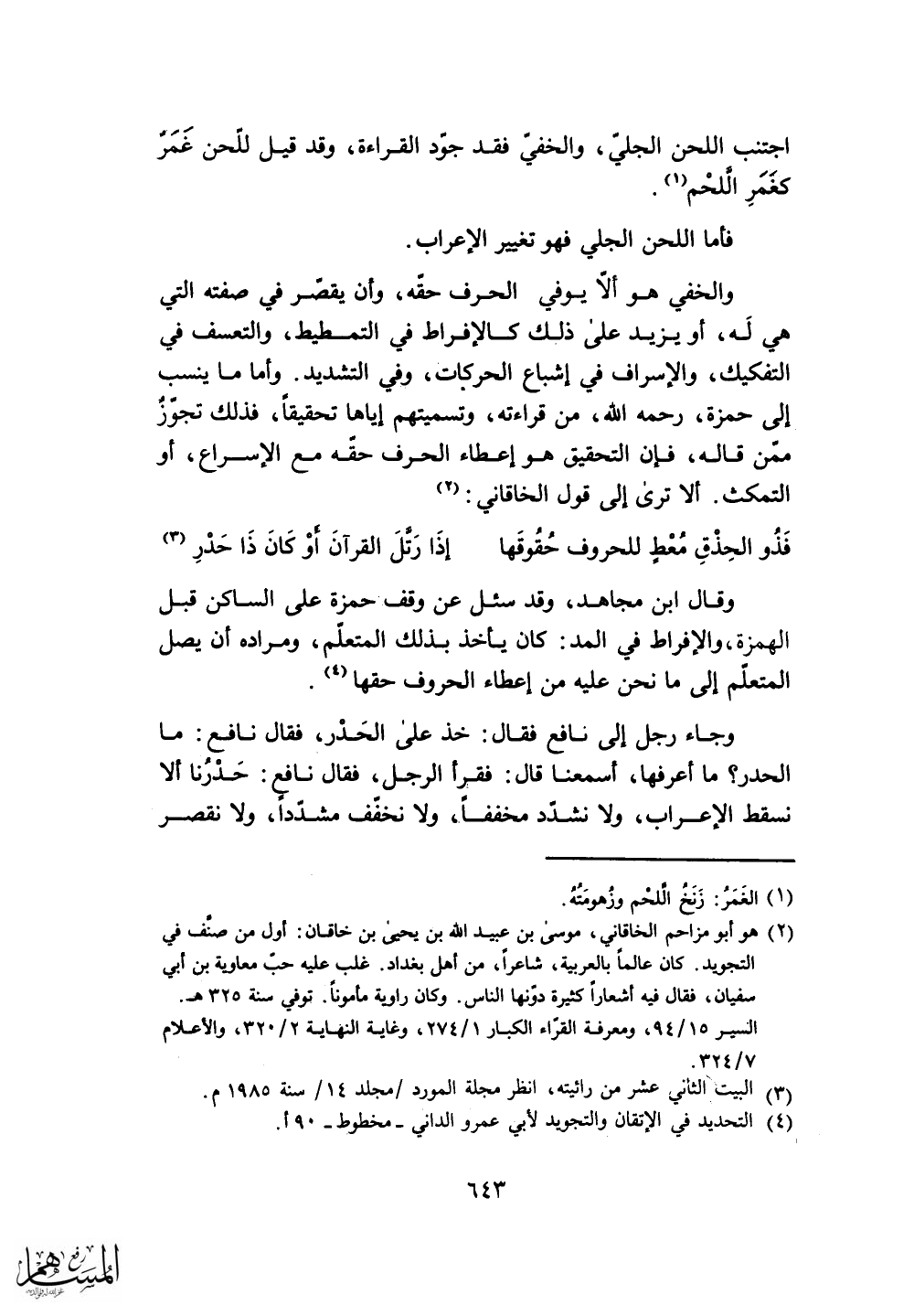 والخفي هو ألَّا يوفي الحرف حقه، وأن يقصر في صفته التي