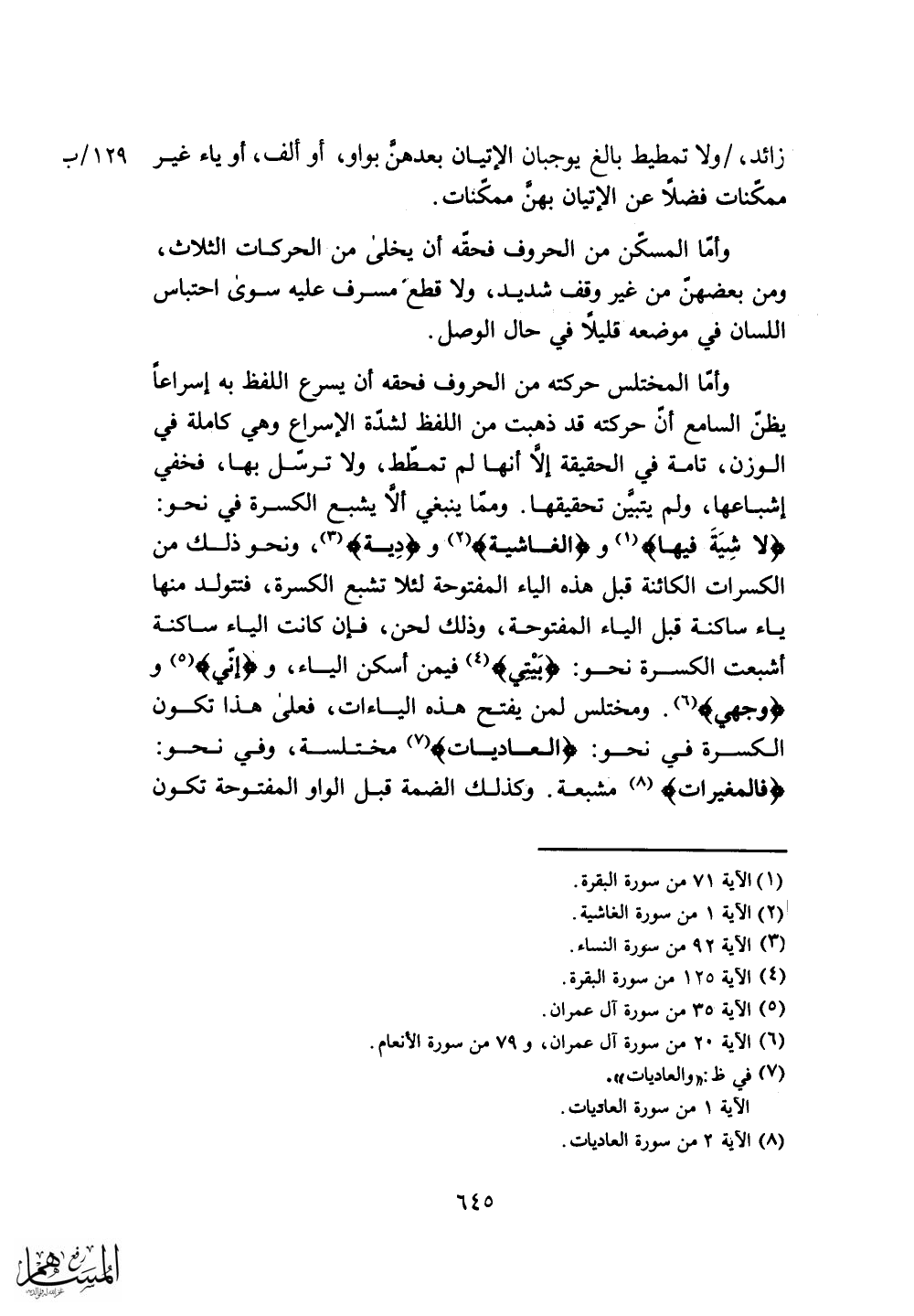 ومما ينبغي ألَّا يشبع الكسرة في نحو: (لا شِيَةَ فيها) و (الغاشية) و (دِية) ، ونحو ذلك من الكسرات الكائنة قبل هذه الياء المفتوحة لئلا تشبع الكسرة، فتتولد منها ياء ساكنة قبل الياء المفتوحة، وذلك لحن، فإن كانت الياء ساكنة أشبعت الكسرة نحو: (بَيْتِي) فيمن أسكن الياء، و (إني)