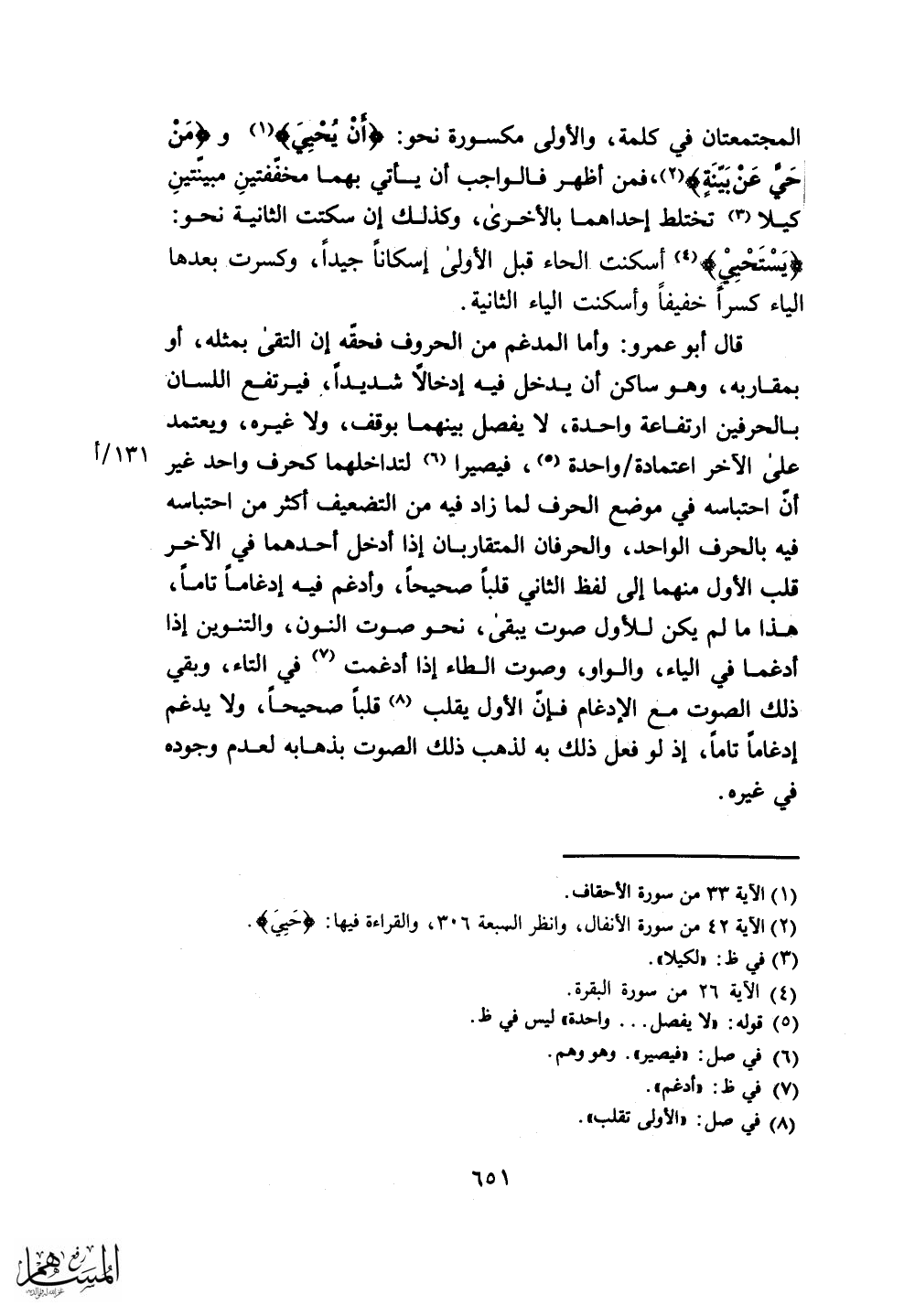 قال أبو عمرو: وأما المدغم من الحروف فحقه إن التقى بمثله، أو