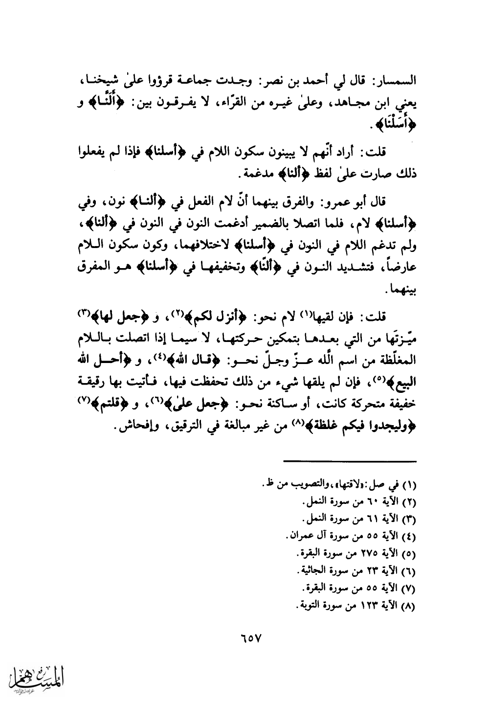 ولم تدغم اللام في النون في (أسلنا) لاختلافهما، وكون سكون اللام