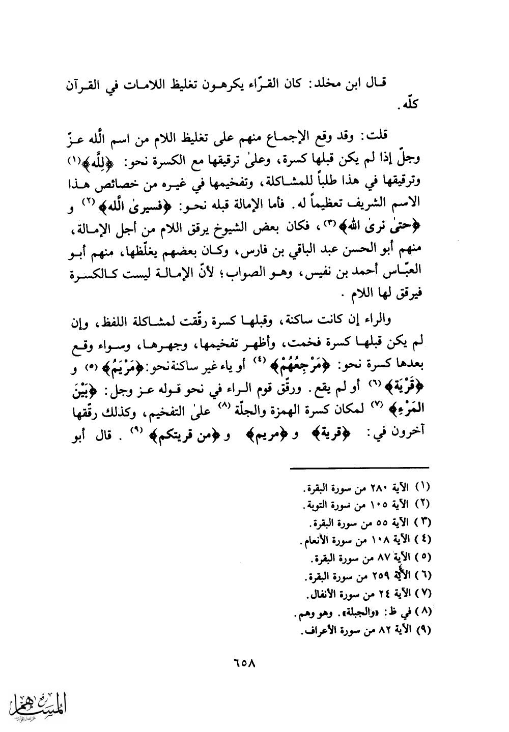 ورقق قوم الراء في نحو قوله عز وجل: (بَيْنَ المَرْءِ) لمكان كسرة الهمزة والجلة على التفخيم، وكذلك رققها آخرون في: (قرية) و (مريم) و (من قريتكم) .