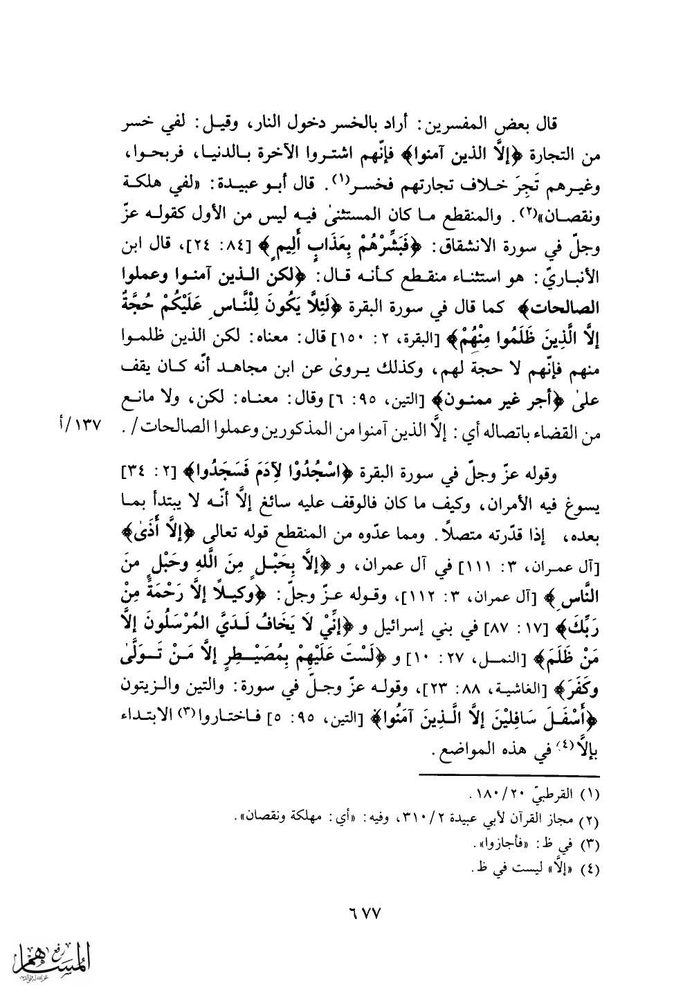 قال: معناه: لكن الذين ظلموا منهم فإنهم لا حجة لهم، وكذلك يروى عن ابن مجاهد أنه كان يقف على (أجر غير ممنون)