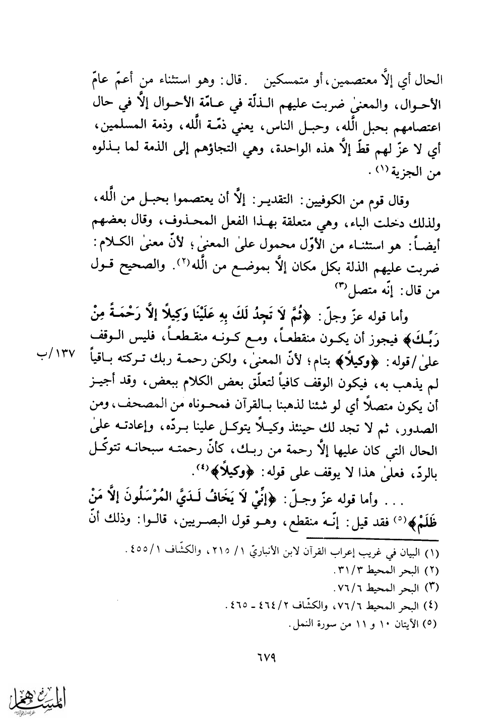 قال: وهو استثناء من أعمّ عامّ الأحوال، والمعنى ضربت عليهم الذلة في عامة الأحوال إلا في حال اعتصامهم بحبل الله، وحبل الناس، يعني ذمة الله، وذمة المسلمين، أي لا عز لهم قط إلا هذه الواحدة، وهي التجاؤهم إلى الذمة لما بذلوه من الجزية.