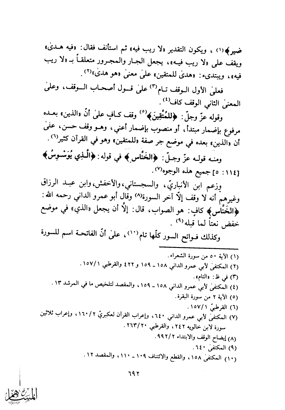 وقوله عزَّ وجلَّ: (للمُتقِينَ) وقف كافٍ على أن (الذين) بعده