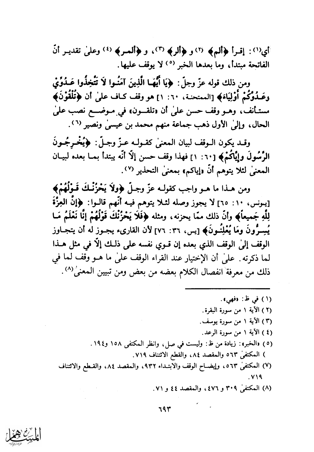 وقد يكون الوقف لبيان المعنى كقوله عز وجل: (يُخْرِجُونَ الرَّسُولَ وَإِيَّاكُمْ) فهذا وقف حسن إلَّا أنه يبتدأ بما بعده لبيان المعنى لثلا يتوهم أن (إِيَّاكُمْ) بمعنى التحذير.