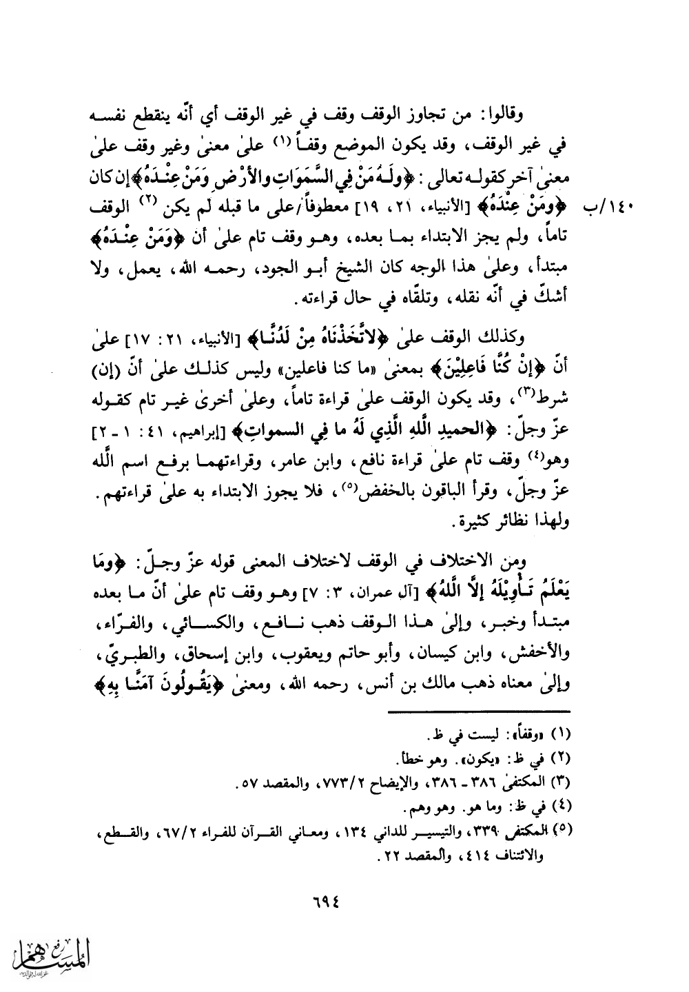 ومن الاختلاف في الوقف لاختلاف المعنى قوله عز وجل: (وَمَا يَعْلَمُ تَأْوِيلَهُ إِلَّا اللَّهُ) ، وهو وقف تام على أن ما بعده مبتدأ وخبر، وإلى هذا الوقف ذهب نافع، والكسائي، والفراء، والأخفش، وابن كيسان، وأبو حاتم ويعقوب، وابن إسحاق، والطبري، وإلى معناه ذهب مالك بن أنس، رحمه الله، ومعنى (يَقُولُونَ آمَنَّا بِهِ)