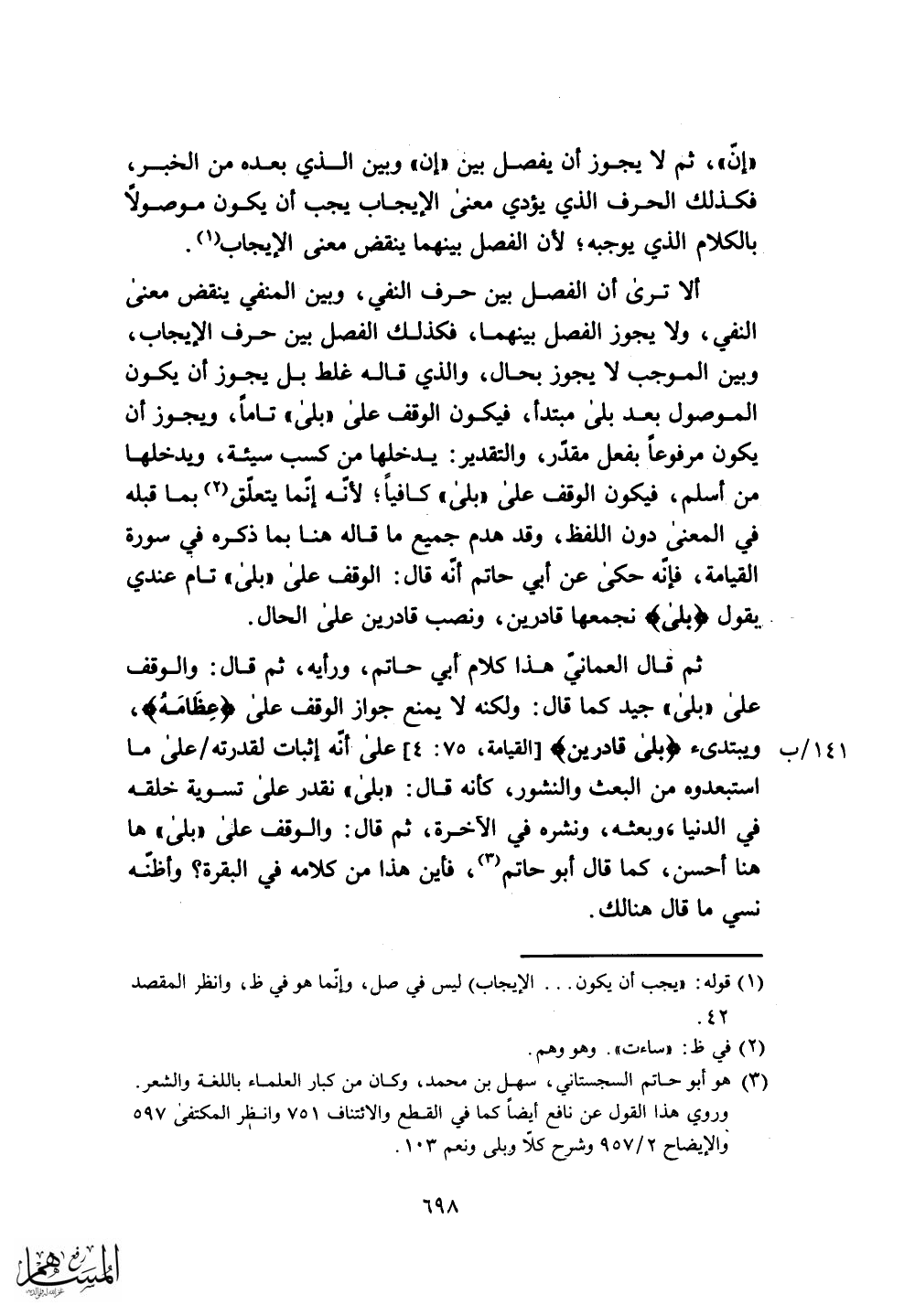 القيامة، فإنه حكى عن أبي حاتم أنه قال: الوقف على (بَلَى) تام عندي