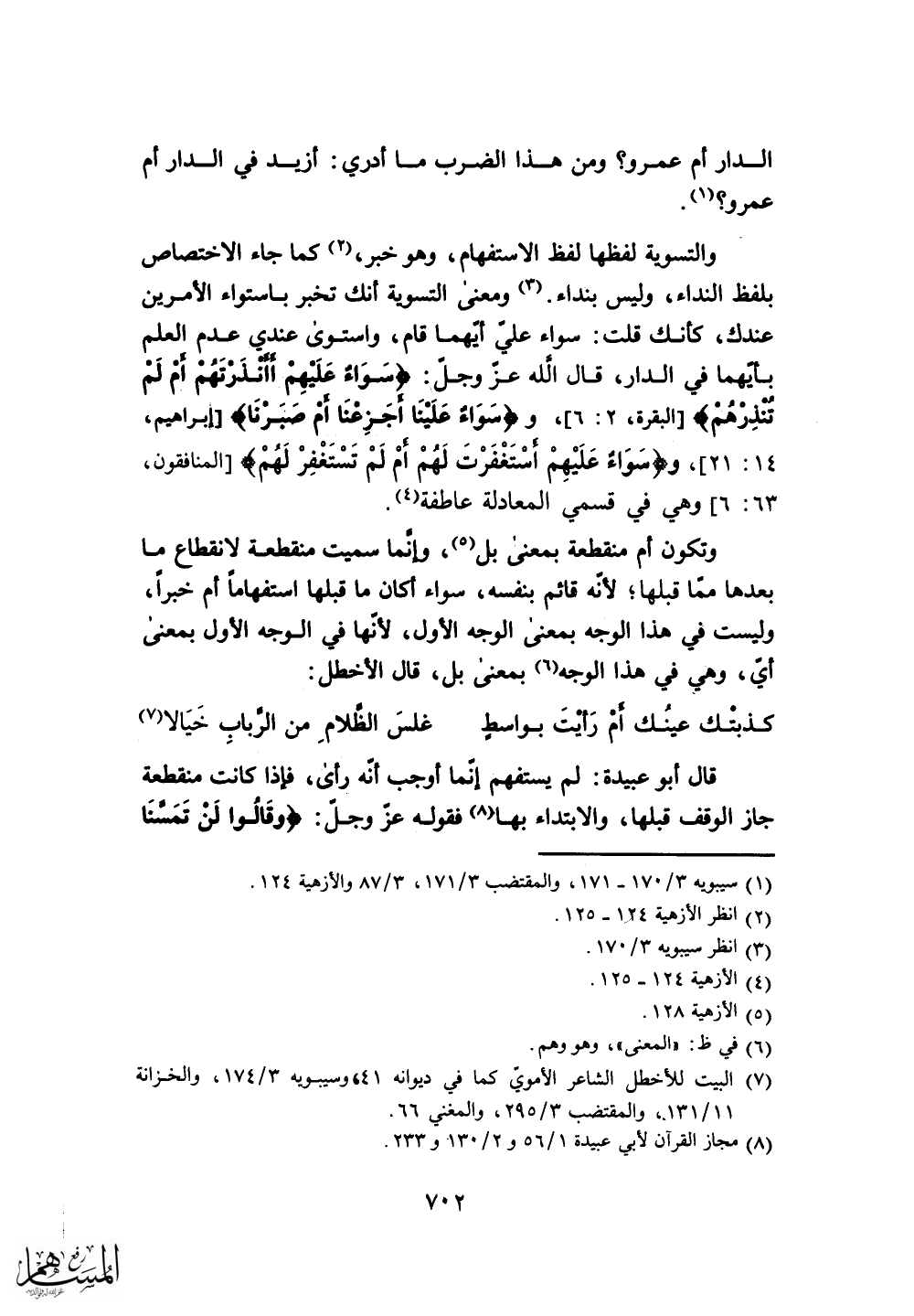 ومعنى التسوية أنك تخبر باستواء الأمرين عندك، كأنك قلت: سواء عليَّ أيهما قام، واستوى عندي عدم العلم بأيهما في الدار، قال الله عز وجل: (سَوَاءٌ عَلَيْهِمْ أَأَنْذَرْتَهُمْ أَمْ لَمْ تُنْذِرْهُمْ) ، و (سَوَاءٌ عَلَيْنَا أَجَزِعْنَا أَمْ صَبَرْنَا) .