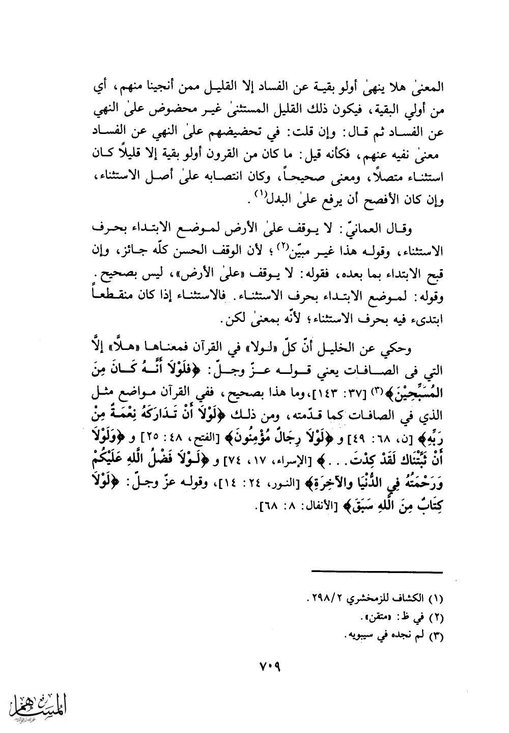 الذي في الصافات كما قدمته، ومن ذلك (لَوْلَا أَنْ تَدَارَكَهُ نِعْمَةٌ مِنْ رَبِّهِ) أن، و (لَوْلاَ رِجَالٌ مُؤْمِنُونَ) و (وَلَوْلاَ أنْ ثَبًتْنَاك لَقَدْ كِدْتَ. . .) .