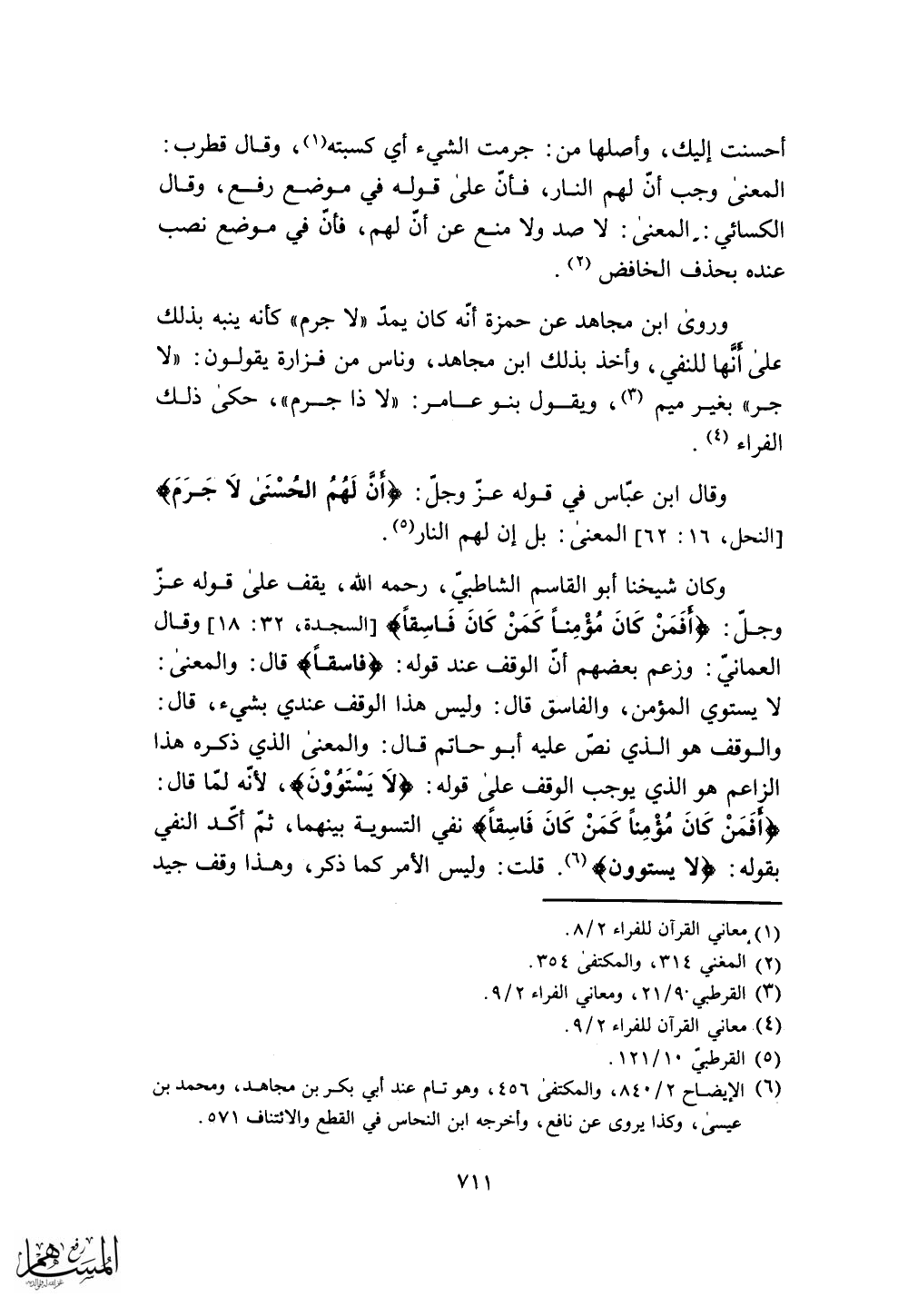 قال: والمعنى: لا يستوي المؤمن، والفاسق قال: وليس هذا الوقف عندي بشيء، قال: والوقف هو الذي نصَّ عليه أبو حاتم قال: والمعنى الذي ذكره هذا الزاعم هو الذي يوجب الوقف على قوله: (لاَ يَسْتَوُوْنَ) ، لأنّه لَمَّا قال: (أَفَمَنْ كَانَ مُؤْمِنًا كَمَنْ كَانَ فَاسِقًا) نفي التسوية بينهما، ثمّ أكد النفي بقوله: (لاَ يَسْتَوُوْنَ) .