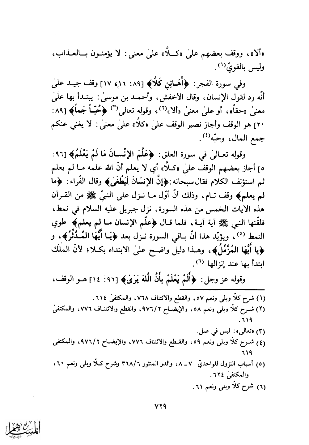 وقال الفراء: (ما لم يعلم) وقف تام، وذلك أن أول ما نزل على النبي - صلى الله عليه وسلم - من القرآن هذه الآيات الخمس من هذه السورة، نزل جبريل عليه السلام في نمط، فلقنها النبي - صلى الله عليه وسلم - آية آية، فلما قال (علَّم الإنسان ما لم يعلم) طوي النمط، ويؤيد هذا أن باقي السورة نزل بعد (يَا أيهَا المُدثَرُ) ، و (يا أيهَا المُزَّمِّلُ) .