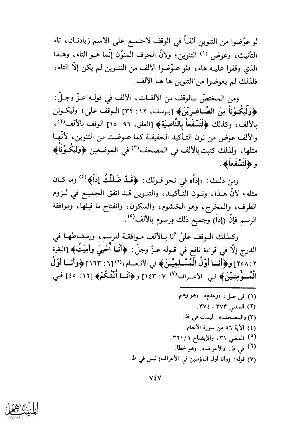 وكذلك الوقف على أنا بالألف موافقة للرسم، وإسقاطها في