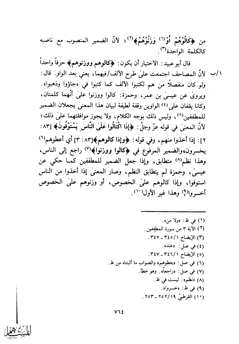 قال أبو عبيد: الاختيار أن يكون: "كالوهم ووزنوهم" حرفاً واحداً