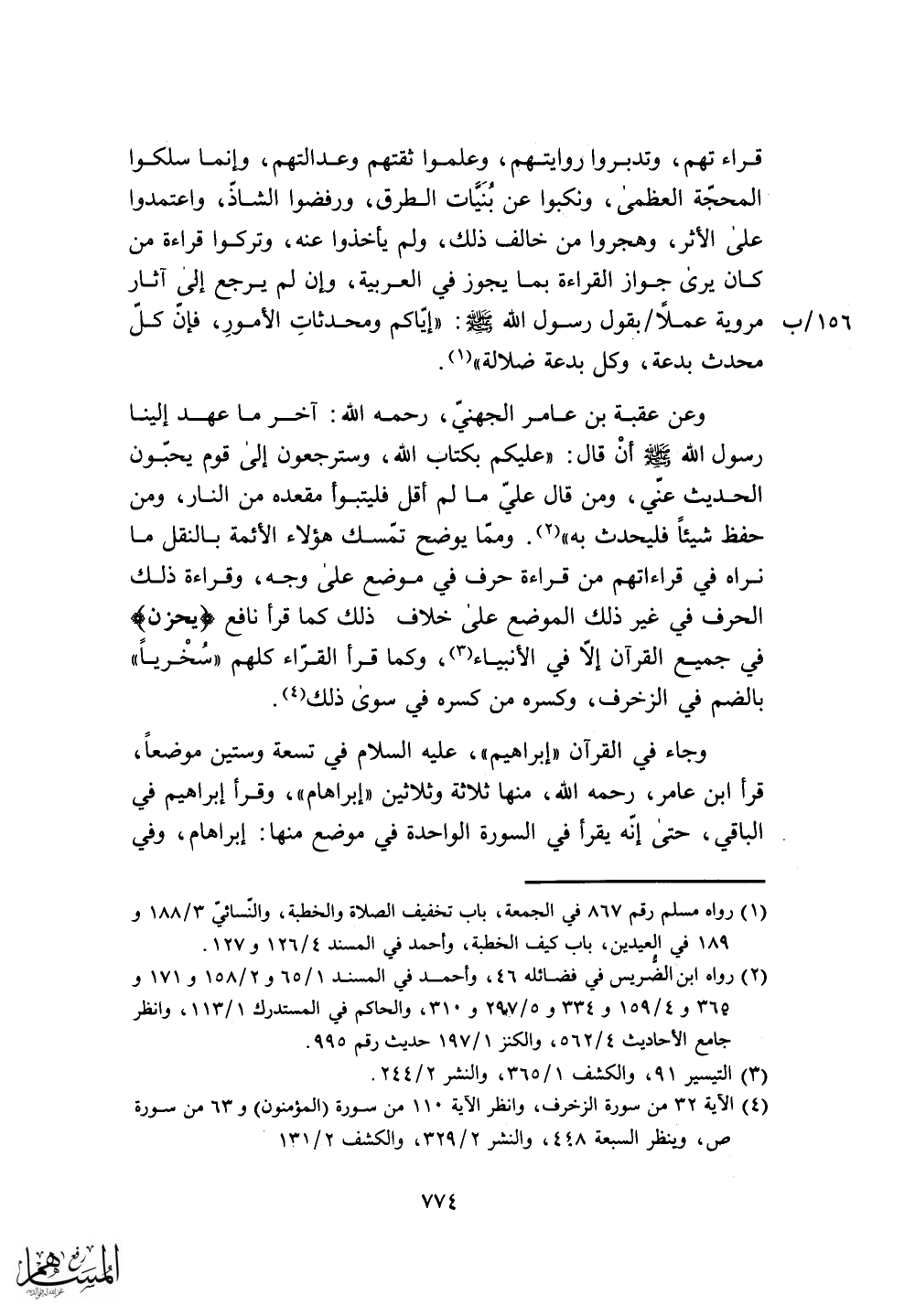 ومما يوضح تفسك هؤلاء الأئمة بالنقل ما نراه في قراءاتهم من قراءة حرف في موضع على وجه، وقراءة ذلك الحرف في غير ذلك الموضع على خلاف ذلك كما قرأ نافع (يحزن) في جميع القرآن إلاّ في الأنبياء، وكما قرأ القرّاء كلهم "سُخْريًّا" بالضم في الزخرف، وكسره من كسره في سوى ذلك.