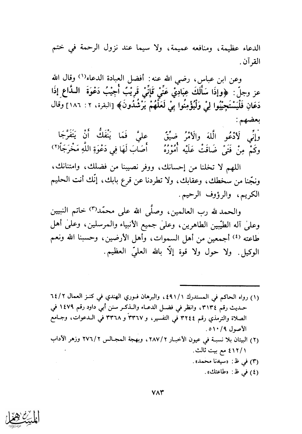 الدعاء عظيمة، ومنافعه عميمة، ولا سيما عند نزول الرحمة في ختم
