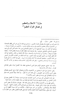 (2) اهتم كثير من العلماء بذكر فضائل القرآن الكريم، مستندين في ذلك لما روي عن النبي صلّى الله عليه وسلم والصحابة من الأحاديث والآثار فاهتموا بالترغيب في دراسته وتلاوته وتدبره، والترهيب من هجرانه ونسيانه، وصنفوا فيه التصانيف وبينوا الصحيح منه من السقيم كالبخاري ومن حذا حذوه كابن كثير وأبي عبيد الهروي والنسائي والقرطبي وغيرهم، وقد تعرضوا لبيان عظمة القرآن وحرمته وفضل قارئه، وكيفية تلاوته واستماعه، وحذروا من قراءته للرياء والسمعة- نسأل الله العافية من ذلك- وكشفوا عما أعد الله لأهل القرآن من النعيم المقيم في جنات النعيم، وما أعد كذلك من العذاب الأليم لمن أعرض عن كتابه الكريم، ووضعوا للمسلم زادا أمامه يتناول منه ما يريد، حتى يقرأ كتاب ربه على بصيرة ويدرسه دراسة نيرة بتدبر وخشوع، وعلى قدر ذلك يؤجّر المسلم