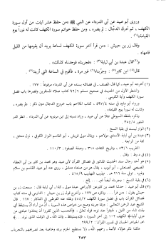 (7) قال أبو عبيد: حدثنا محمد بن كثير عن الأوزاعي عبدة مولى- كذا- أبي لبابة قال: سمعت زر بن حبيش يقول: «من قرأ ... وذكره ص 177، وأخرج قول زر بن حبيش: الدارمي في سننه كتاب فضائل القرآن باب في فضل سورة الكهف 2/ 454 ونقله عنه القرطبي في التذكار: 167. قال الشيخ عبد الرحمن الثعالبي: «ومما جربته وصح من خواص هذه السورة، أنّ من أراد أن يستيقظ أي وقت شاء من الليل، فليقرأ عند نومه قوله تعالى: أَفَحَسِبَ الَّذِينَ كَفَرُوا أَنْ يَتَّخِذُوا عِبادِي مِنْ دُونِي أَوْلِياءَ الكهف 102 إلى آخر السورة، فإنه يستيقظ- بإذن الله- في الوقت الذي نواه ...