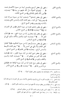 والتسع الخامس: ينتهي في بعض ثمان وعشرين آية من سورة الحج، عند وَأُحِلَّتْ لَكُمُ الأ ... «5» وصارت النون والعين والألف والميم التي في الأنعام من التسع السادس.