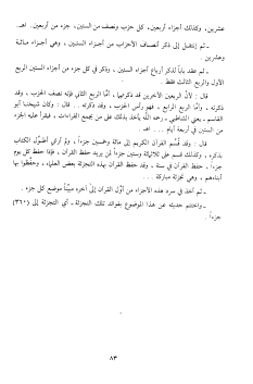 قال: وقد قسّم القرآن الكريم إلى مائة وخمسين جزءا، ولم أراني أطوّل الكتاب بذكره، وكذلك قسم على ثلاثمائة وستين جزءا لمن يريد حفظ القرآن، فإذا حفظ كل يوم جزءا، حفظ القرآن في سنة، وقد حفظ القرآن بهذه التجزئة بعض العلماء، وحفّظوا بها أبناءهم، وهي تجزئة مباركة ...