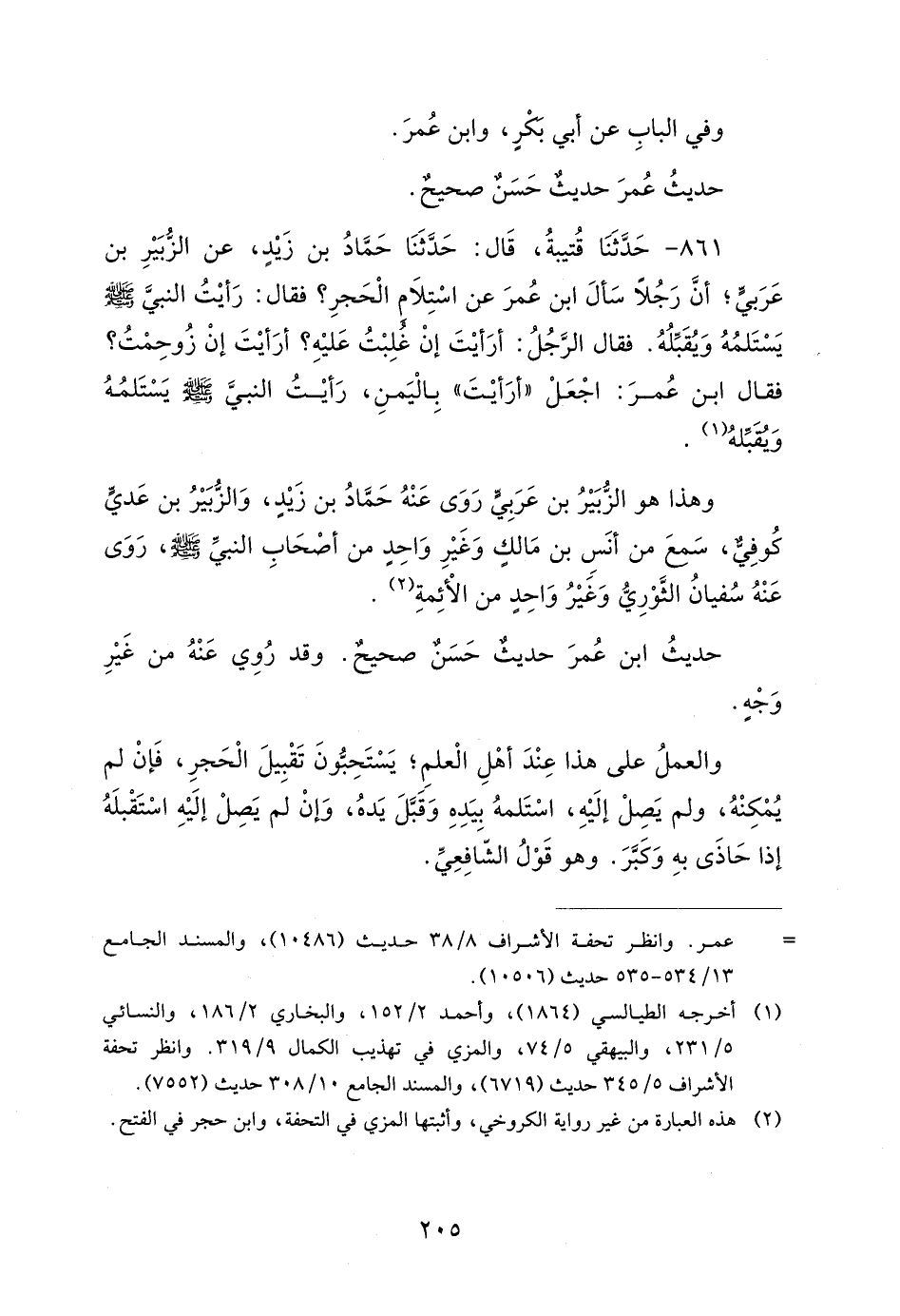 حَدِيثُ ابْنِ عَبَّاسٍ حَدِيثٌ حَسَنٌ صَحِيحٌ. وَالعَمَلُ عَلَى هَذَا عِنْدَ أَكْثَرِ أَهْلِ العِلْمِ: أَنْ لاَ يَسْتَلِمَ إِلاَّ الحَجَرَ الأَسْوَدَ، وَالرُّكْنَ اليَمَانِيَ.