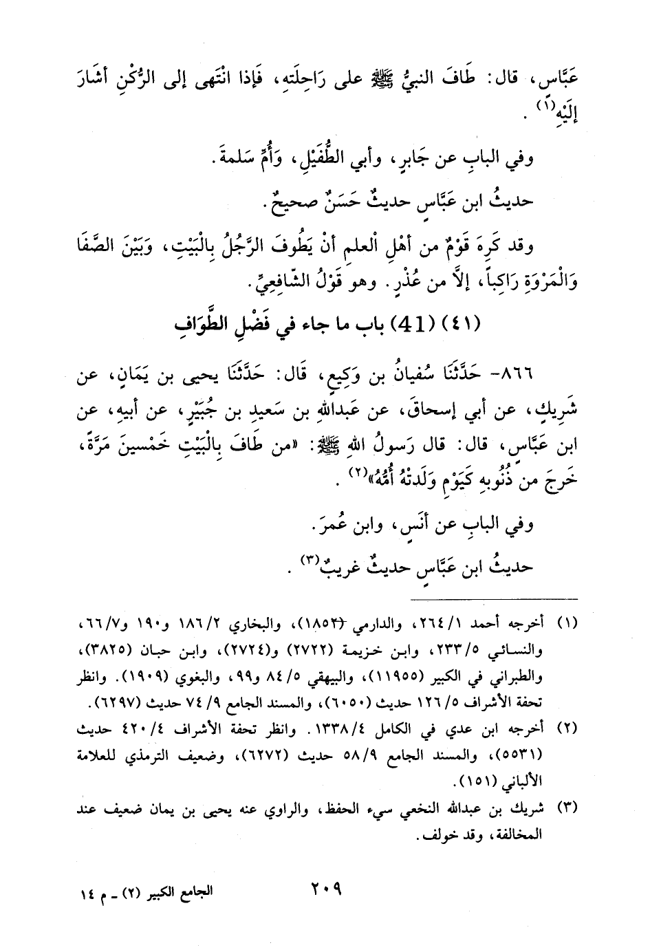حَدِيثُ ابْنِ عَبَّاسٍ حَدِيثٌ حَسَنٌ صَحِيحٌ، وَهُوَ الَّذِي يَسْتَحِبُّهُ أَهْلُ العِلْمِ أَنْ يَسْعَى بَيْنَ الصَّفَا وَالمَرْوَةِ، فَإِنْ لَمْ يَسْعَ وَمَشَى بَيْنَ الصَّفَا وَالمَرْوَةِ رَأَوْهُ جَائِزًا.