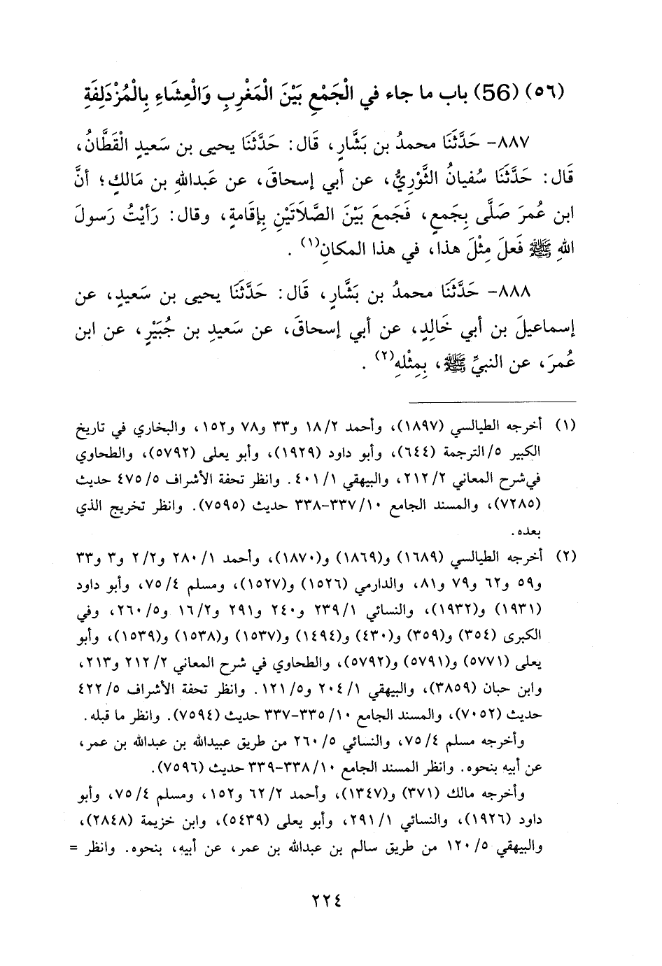 885 - حَدَّثَنَا مُحَمَّدُ بْنُ بَشَّارٍ، قَالَ: حَدَّثَنَا أَبُو أَحْمَدَ الزُّبَيْرِيُّ، قَالَ: حَدَّثَنَا سُفْيَانُ، عَنْ عَبْدِ الرَّحْمَنِ بْنِ الحَارِثِ بْنِ عَيَّاشِ بْنِ أَبِي رَبِيعَةَ، عَنْ زَيْدِ بْنِ عَلِيٍّ، عَنْ أَبِيهِ، عَنْ عُبَيْدِ اللهِ بْنِ أَبِي رَافِعٍ، عَنْ عَلِيِّ بْنِ أَبِي طَالِبٍ قَالَ: وَقَفَ رَسُولُ اللهِ صَلَّى اللَّهُ عَلَيْهِ وَسَلَّمَ بِعَرَفَةَ، فَقَالَ: هَذِهِ عَرَفَةُ، وَهُوَ الْمَوْقِفُ، وَعَرَفَةُ كُلُّهَا مَوْقِفٌ، ثُمَّ أَفَاضَ حِينَ غَرَبَتِ الشَّمْسُ، وَأَرْدَفَ أُسَامَةَ بْنَ زَيْدٍ، وَجَعَلَ يُشِيرُ بِيَدِهِ عَلَى هِيْئَتِهِ، وَالنَّاسُ يَضْرِبُونَ يَمِينًا وَشِمَالاً، يَلْتَفِتُ إِلَيْهِمْ، وَيَقُولُ: يَا أَيُّهَا النَّاسُ عَلَيْكُمُ السَّكِينَةَ، ثُمَّ أَتَى جَمْعًا فَصَلَّى بِهِمُ الصَّلاَتَيْنِ جَمِيعًا، فَلَمَّا أَصْبَحَ أَتَى قُزَحَ فَوَقَفَ عَلَيْهِ، وَقَالَ: هَذَا قُزَحُ وَهُوَ الْمَوْقِفُ، وَجَمْعٌ كُلُّهَا مَوْقِفٌ، ثُمَّ أَفَاضَ حَتَّى انْتَهَى إِلَى وَادِي مُحَسِّرٍ، فَقَرَعَ نَاقَتَهُ، فَخَبَّتْ حَتَّى جَاوَزَ الوَادِيَ فَوَقَفَ، وَأَرْدَفَ الفَضْلَ ثُمَّ أَتَى الجَمْرَةَ فَرَمَاهَا، ثُمَّ أَتَى الْمَنْحَرَ، فَقَالَ: هَذَا الْمَنْحَرُ وَمِنًى كُلُّهَا مَنْحَرٌ.