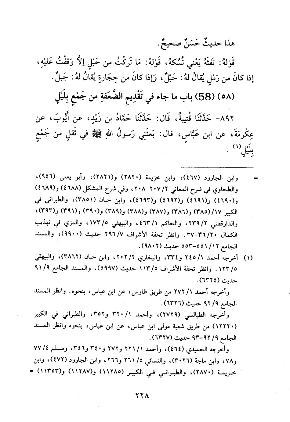 حَدِيثُ ابْنُ عُمَرَ فِي رِوَايَةِ سُفْيَانَ أَصَحُّ مِنْ رِوَايَةِ إِسْمَاعِيلَ بْنِ أَبِي خَالِدٍ، وَحَدِيثُ سُفْيَانَ حَدِيثٌ حَسَنٌ صَحِيحٌ, وَالعَمَلُ عَلَى هَذَا عِنْدَ أَهْلِ العِلْمِ لأَنَّهُ لاَ تُصَلَّى صَلاَةُ الْمَغْرِبِ دُونَ جَمْعٍ، فَإِذَا أَتَى جَمْعًا وَهُوَ الْمُزْدَلِفَةُ جَمَعَ بَيْنَ الصَّلاَتَيْنِ بِإِقَامَةٍ وَاحِدَةٍ، وَلَمْ يَتَطَوَّعْ فِيمَا بَيْنَهُمَا، وَهُوَ الَّذِي اخْتَارَهُ بَعْضُ أَهْلِ العِلْمِ، وَذَهَبَ إِلَيْهِ، وَهُوَ قَوْلُ سُفْيَانَ الثَّوْرِيِّ قَالَ سُفْيَانُ: وَإِنْ شَاءَ صَلَّى الْمَغْرِبَ، ثُمَّ تَعَشَّى وَوَضَعَ ثِيَابَهُ، ثُمَّ أَقَامَ فَصَلَّى العِشَاءَ وَقَالَ بَعْضُ أَهْلِ العِلْمِ: يَجْمَعُ بَيْنَ الْمَغْرِبِ وَالعِشَاءِ بِالمُزْدَلِفَةِ بِأَذَانٍ وَإِقَامَتَيْنِ، يُؤَذِّنُ لِصَلاَةِ الْمَغْرِبِ وَيُقِيمُ، وَيُصَلِّي الْمَغْرِبَ ثُمَّ يُقِيمُ وَيُصَلِّي العِشَاءَ، وَهُوَ قَوْلُ الشَّافِعِيِّ.