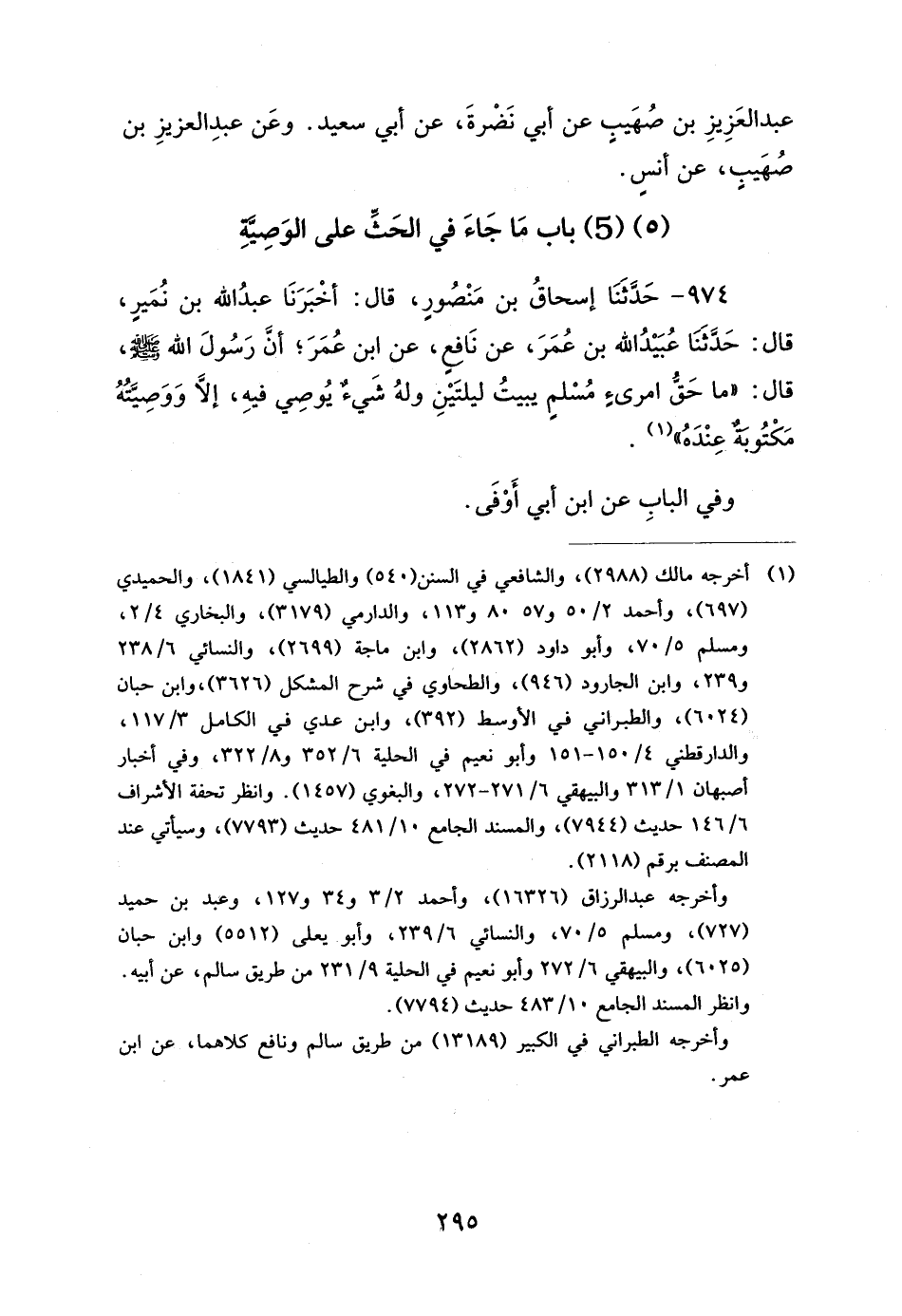 974 - حَدَّثَنَا إِسْحَاقُ بْنُ مَنْصُورٍ، قَالَ: أَخْبَرَنَا عَبْدُ اللهِ بْنُ نُمَيْرٍ، قَالَ: حَدَّثَنَا عُبَيْدُ اللهِ بْنُ عُمَرَ، عَنْ نَافِعٍ، عَنِ ابْنِ عُمَرَ، أَنَّ رَسُولَ اللهِ صَلَّى اللَّهُ عَلَيْهِ وَسَلَّمَ قَالَ: مَا حَقُّ امْرِئٍ مُسْلِمٍ يَبِيتُ لَيْلَتَيْنِ وَلَهُ شَيْءٌ يُوصِي فِيهِ إِلاَّ وَوَصِيَّتُهُ مَكْتُوبَةٌ عِنْدَهُ وَفِي البَاب عَنِ ابْنِ أَبِي أَوْفَى.