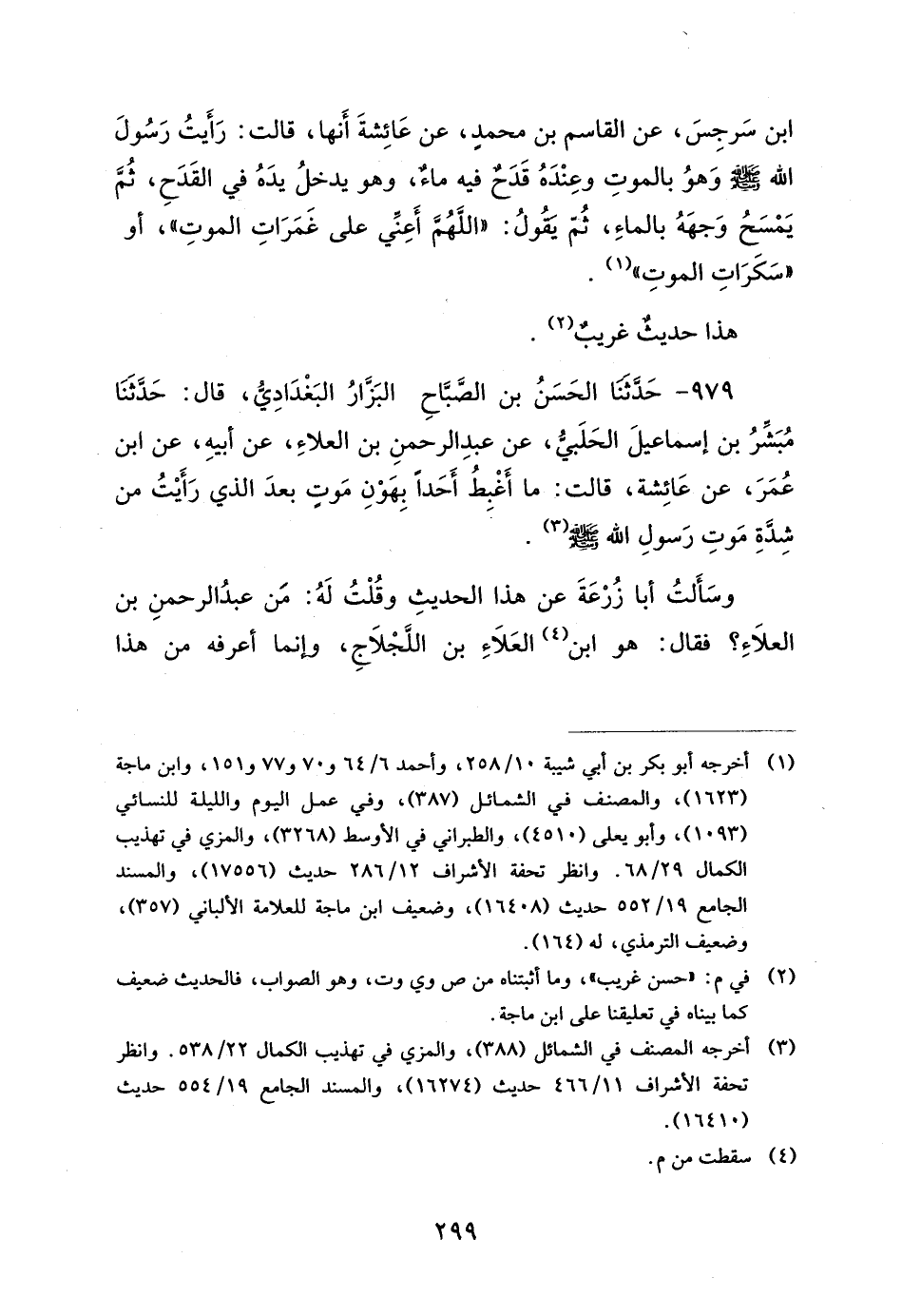 978 - حَدَّثَنَا قُتَيْبَةُ، قَالَ: حَدَّثَنَا اللَّيْثُ، عَنِ ابْنِ الهَادِ، عَنْ مُوسَى بْنِ سَرْجِسَ، عَنِ القَاسِمِ بْنِ مُحَمَّدٍ، عَنْ عَائِشَةَ، أَنَّهَا قَالَتْ: رَأَيْتُ رَسُولَ اللهِ صَلَّى اللَّهُ عَلَيْهِ وَسَلَّمَ وَهُوَ بِالمَوْتِ، وَعِنْدَهُ قَدَحٌ فِيهِ مَاءٌ، وَهُوَ يُدْخِلُ يَدَهُ فِي القَدَحِ، ثُمَّ يَمْسَحُ وَجْهَهُ بِالمَاءِ، ثُمَّ يَقُولُ: اللَّهُمَّ أَعِنِّي عَلَى غَمَرَاتِ الْمَوْتِ أَوْ سَكَرَاتِ الْمَوْتِ.