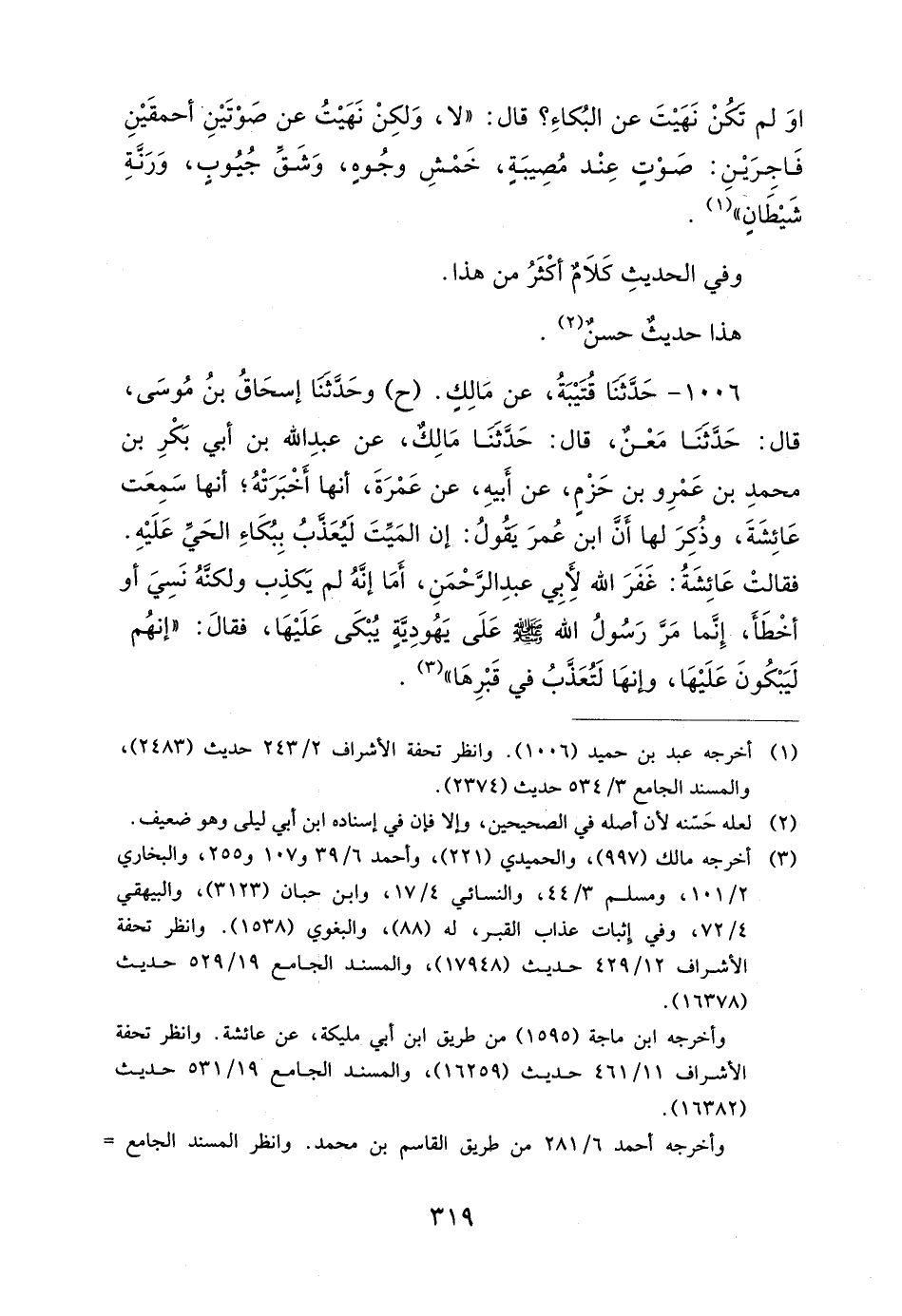 1005 - حَدَّثَنَا عَلِيُّ بْنُ خَشْرَمٍ، قَالَ: أَخْبَرَنَا عِيسَى بْنُ يُونُسَ، عَنِ ابْنِ أَبِي لَيْلَى، عَنْ عَطَاءٍ، عَنْ جَابِرِ بْنِ عَبْدِ اللهِ قَالَ: أَخَذَ النَّبِيُّ صَلَّى اللَّهُ عَلَيْهِ وَسَلَّمَ بِيَدِ عَبْدِ الرَّحْمَنِ بْنِ عَوْفٍ، فَانْطَلَقَ بِهِ إِلَى ابْنِهِ إِبْرَاهِيمَ، فَوَجَدَهُ يَجُودُ بِنَفْسِهِ، فَأَخَذَهُ النَّبِيُّ صَلَّى اللَّهُ عَلَيْهِ وَسَلَّمَ، فَوَضَعَهُ فِي حِجْرِهِ فَبَكَى، فَقَالَ لَهُ عَبْدُ الرَّحْمَنِ: أَتَبْكِي؟ أَوَلَمْ تَكُنْ نَهَيْتَ عَنِ البُكَاءِ؟ قَالَ: لاَ، وَلَكِنْ نَهَيْتُ عَنْ صَوْتَيْنِ أَحْمَقَيْنِ فَاجِرَيْنِ: صَوْتٍ عِنْدَ مُصِيبَةٍ، خَمْشِ وُجُوهٍ، وَشَقِّ جُيُوبٍ، وَرَنَّةِ شَيْطَانٍ.