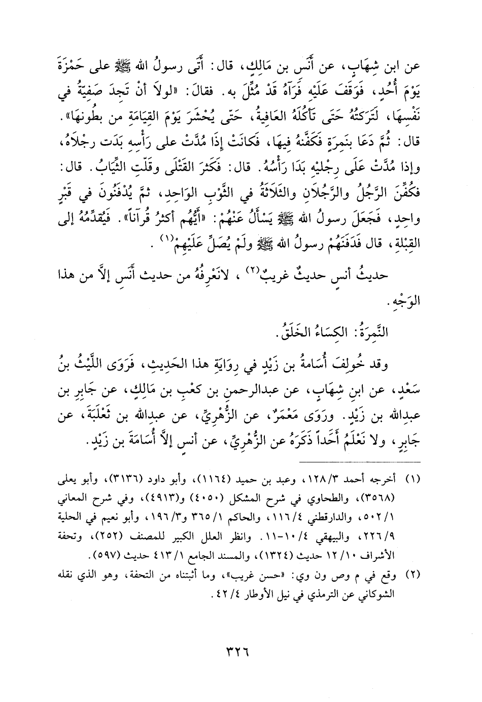 1016 - حَدَّثَنَا قُتَيْبَةُ، قَالَ: حَدَّثَنَا أَبُو صَفْوَانَ، عَنْ أُسَامَةَ بْنِ زَيْدٍ، عَنِ ابْنِ شِهَابٍ، عَنْ أَنَسِ بْنِ مَالِكٍ قَالَ: أَتَى رَسُولُ اللهِ صَلَّى اللَّهُ عَلَيْهِ وَسَلَّمَ عَلَى حَمْزَةَ يَوْمَ أُحُدٍ، فَوَقَفَ عَلَيْهِ فَرَآهُ قَدْ مُثِّلَ بِهِ، فَقَالَ: لَوْلاَ أَنْ تَجِدَ صَفِيَّةُ فِي نَفْسِهَا، لَتَرَكْتُهُ حَتَّى تَأْكُلَهُ العَافِيَةُ، حَتَّى يُحْشَرَ يَوْمَ القِيَامَةِ مِنْ بُطُونِهَا.