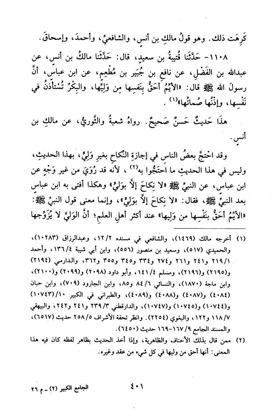 وَالعَمَلُ فِي هَذَا البَابِ عَلَى حَدِيثِ النَّبِيِّ صَلَّى اللَّهُ عَلَيْهِ وَسَلَّمَ: لاَ نِكَاحَ إِلاَّ بِوَلِيٍّ عِنْدَ أَهْلِ العِلْمِ مِنْ أَصْحَابِ النَّبِيِّ صَلَّى اللَّهُ عَلَيْهِ وَسَلَّمَ مِنْهُمْ عُمَرُ بْنُ الخَطَّابِ، وَعَلِيُّ بْنُ أَبِي طَالِبٍ، وَعَبْدُ اللهِ بْنُ عَبَّاسٍ وَأَبُو هُرَيْرَةَ وَغَيْرُهُمْ.