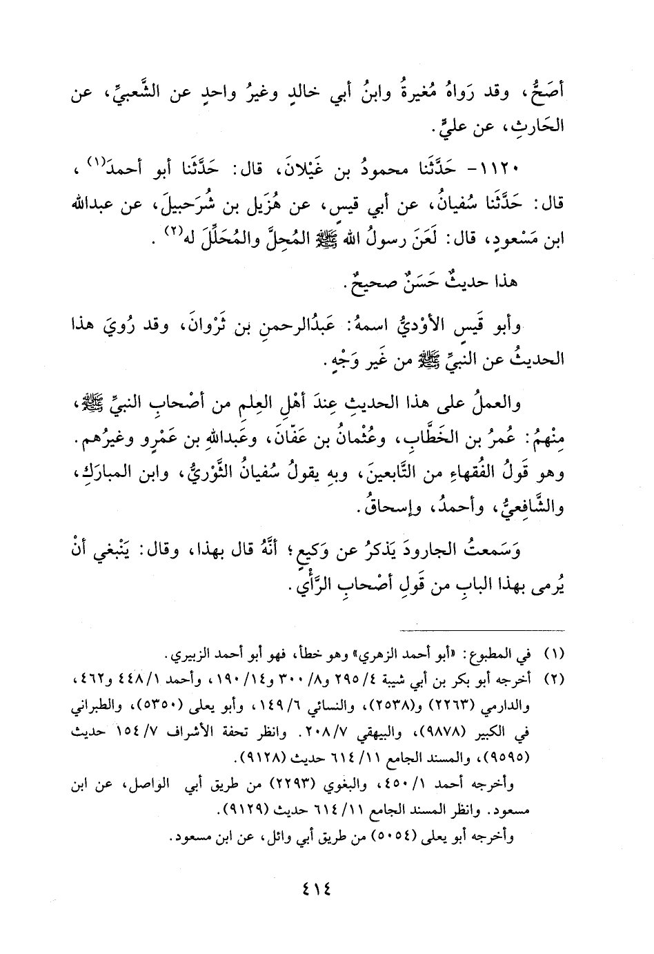 1114م- حَدَّثَنَا ابْنُ أَبِي عُمَرَ، قَالَ: حَدَّثَنَا سُفْيَانُ بْنُ عُيَيْنَةَ، عَنْ أَيُّوبَ، عَنِ ابْنِ سِيرِينَ، عَنْ أَبِي العَجْفَاءِ السُّلَمِيِّ، قَالَ: قَالَ عُمَرُ بْنُ الخَطَّابِ: أَلاَ لاَ تُغَالُوا صَدُقَةَ النِّسَاءِ، فَإِنَّهَا لَوْ كَانَتْ مَكْرُمَةً فِي الدُّنْيَا، أَوْ تَقْوَى عِنْدَ اللهِ لَكَانَ أَوْلاَكُمْ بِهَا نَبِيُّ اللهِ صَلَّى اللَّهُ عَلَيْهِ وَسَلَّمَ، مَا عَلِمْتُ رَسُولَ اللهِ صَلَّى اللَّهُ عَلَيْهِ وَسَلَّمَ نَكَحَ شَيْئًا مِنْ نِسَائِهِ وَلاَ أَنْكَحَ شَيْئًا مِنْ بَنَاتِهِ عَلَى أَكْثَرَ مِنْ ثِنْتَيْ عَشْرَةَ أُوقِيَّةً.
