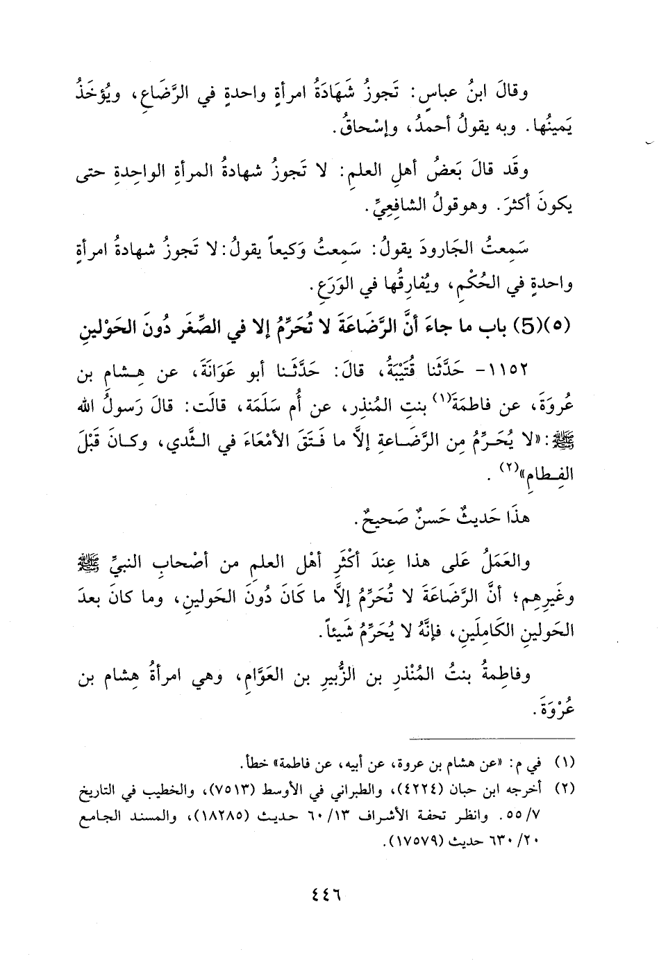وَفِي البَاب عَنْ أُمِّ الفَضْلِ، وَأَبِي هُرَيْرَةَ، وَالزُّبَيْرِ بْنِ العَوَّامِ، وَابْنِ الزُّبَيْرِ. وَرَوَى غَيْرُ وَاحِدٍ هَذَا الحَدِيثَ، عَنْ هِشَامِ بْنِ عُرْوَةَ، عَنْ أَبِيهِ، عَنْ عَبْدِ اللهِ بْنِ الزُّبَيْرِ، عَنِ النَّبِيِّ صَلَّى اللَّهُ عَلَيْهِ وَسَلَّمَ قَالَ: لاَ تُحَرِّمُ الْمَصَّةُ وَلاَ الْمَصَّتَانِ.