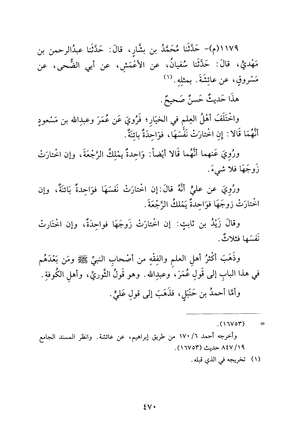 1176 - حَدَّثَنَا هَنَّادٌ، قَالَ: حَدَّثَنَا وَكِيعٌ، عَنْ سُفْيَانَ، عَنْ مُحَمَّدِ بْنِ عَبْدِ الرَّحْمَنِ، مَوْلَى آلِ طَلْحَةَ، عَنْ سَالِمٍ، عَنْ أَبِيهِ، أَنَّهُ طَلَّقَ امْرَأَتَهُ فِي الحَيْضِ، فَسَأَلَ عُمَرُ النَّبِيَّ صَلَّى اللَّهُ عَلَيْهِ وَسَلَّمَ، فَقَالَ: مُرْهُ فَلْيُرَاجِعْهَا، ثُمَّ لِيُطَلِّقْهَا طَاهِرًا أَوْ حَامِلاً.