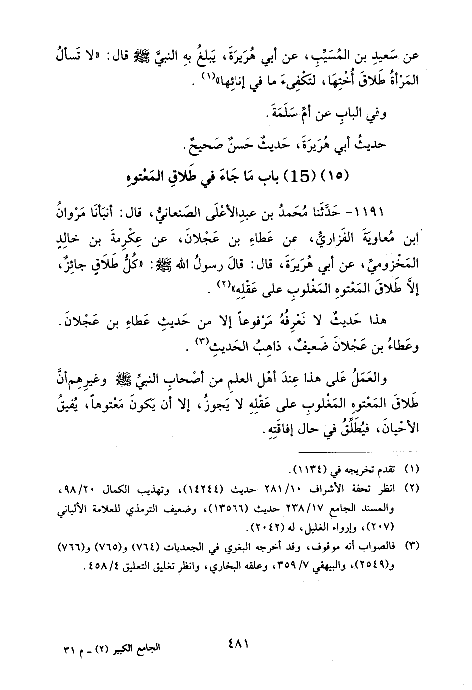 1184 - حَدَّثَنَا قُتَيْبَةُ، قَالَ: حَدَّثَنَا حَاتِمُ بْنُ إِسْمَاعِيلَ، عَنْ عَبْدِ الرَّحْمَنِ بْنِ أَرْدَكَ، عَنْ عَطَاءٍ، عَنِ ابْنِ مَاهَكَ، عَنْ أَبِي هُرَيْرَةَ قَالَ: قَالَ رَسُولُ اللهِ صَلَّى اللَّهُ عَلَيْهِ وَسَلَّمَ: ثَلاَثٌ جِدُّهُنَّ جِدٌّ، وَهَزْلُهُنَّ جِدٌّ: النِّكَاحُ، وَالطَّلاَقُ، وَالرَّجْعَةُ.