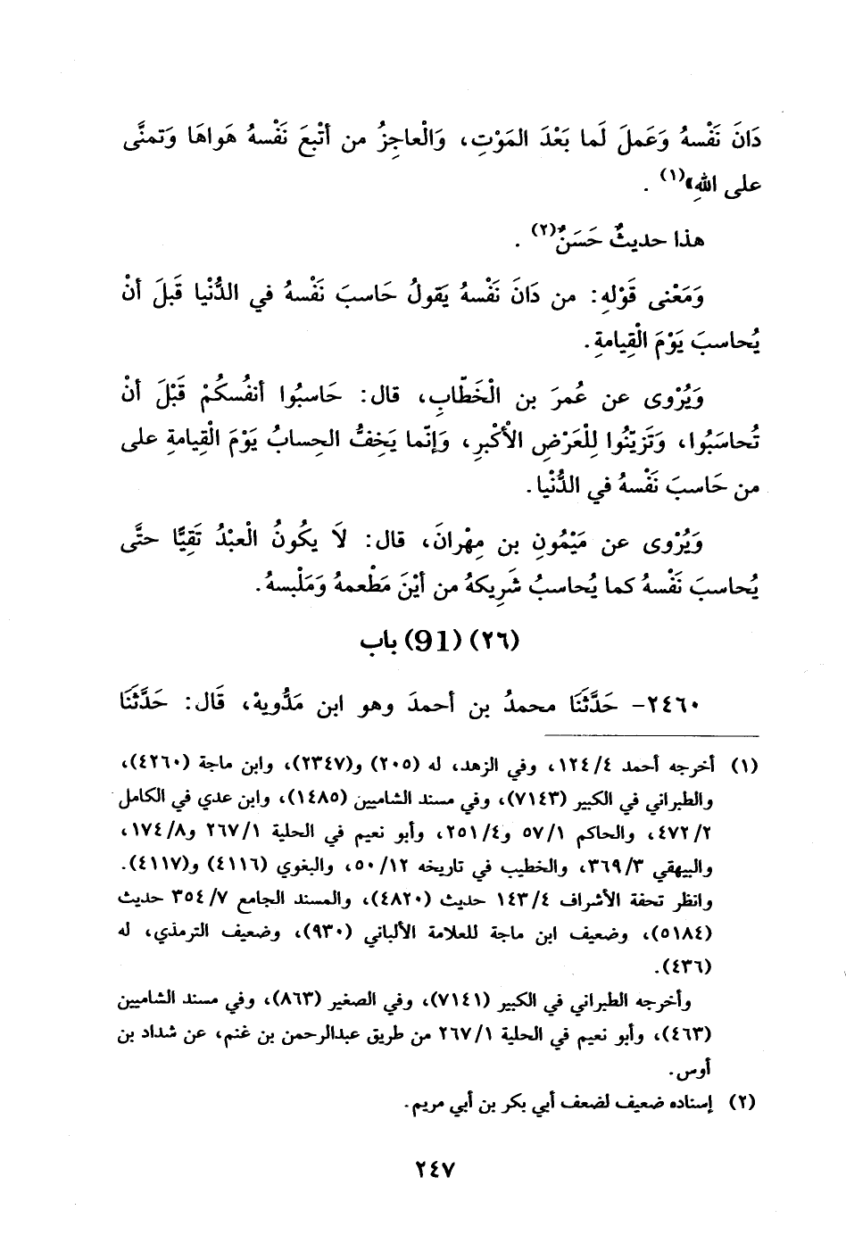 2514 - حَدَّثَنَا بِشْرُ بْنُ هِلاَلٍ البَصْرِيُّ، قَالَ: حَدَّثَنَا جَعْفَرُ بْنُ سُلَيْمَانَ، عَنْ سَعِيدٍ الجُرَيْرِيِّ (ح) وحَدَّثَنَا هَارُونُ بْنُ عَبْدِ اللهِ البَزَّازُ، قَالَ: حَدَّثَنَا سَيَّارٌ، قَالَ: حَدَّثَنَا جَعْفَرُ بْنُ سُلَيْمَانَ، عَنْ سَعِيدٍ الجُرَيْرِيِّ، وَالْمَعْنَى وَاحِدٌ عَنْ أَبِي عُثْمَانَ النَّهْدِيِّ، عَنْ حَنْظَلَةَ الأُسَيِّدِيِّ،، وَكَانَ مِنْ كُتَّابِ النَّبِيِّ صَلَّى اللَّهُ عَلَيْهِ وَسَلَّمَ، أَنَّهُ مَرَّ بِأَبِي بَكْرٍ وَهُوَ يَبْكِي، فَقَالَ: مَا لَكَ يَا حَنْظَلَةُ؟ قَالَ: نَافَقَ حَنْظَلَةُ يَا أَبَا بَكْرٍ، نَكُونُ عِنْدَ رَسُولِ اللهِ صَلَّى اللَّهُ عَلَيْهِ وَسَلَّمَ يُذَكِّرُنَا بِالنَّارِ وَالجَنَّةِ كَأَنَّا رَأْيَ عَيْنٍ، فَإِذَا رَجَعْنَا عَافَسْنَا الأَزْوَاجِ وَالضَّيْعَةِ وَنَسِينَا كَثِيرًا، قَالَ: فَوَاللَّهِ إِنَّا لَكَذَلِكَ، انْطَلِقْ بِنَا إِلَى رَسُولِ اللهِ صَلَّى اللَّهُ عَلَيْهِ وَسَلَّمَ فَانْطَلَقْنَا، فَلَمَّا رَآهُ رَسُولُ اللهِ صَلَّى اللَّهُ عَلَيْهِ وَسَلَّمَ قَالَ: مَا لَكَ يَا حَنْظَلَةُ؟ قَالَ: نَافَقَ حَنْظَلَةُ يَا رَسُولَ اللهِ، نَكُونُ عِنْدَكَ تُذَكِّرُنَا بِالنَّارِ وَالجَنَّةِ كَأَنَّا رَأْيَ عَيْنٍ، فَإِذَا رَجَعْنَا عَافَسْنَا الأَزْوَاجَ وَالضَّيْعَةَ وَنَسِينَا كَثِيرًا، قَالَ: فَقَالَ رَسُولُ اللهِ صَلَّى اللَّهُ عَلَيْهِ وَسَلَّمَ: لَوْ تَدُومُونَ عَلَى الْحَالِ الَّتِي تَقُومُونَ بِهَا مِنْ عِنْدِي لَصَافَحَتْكُمُ الْمَلاَئِكَةُ فِي مَجَالِسِكُمْ، وَفِي طُرُقِكُمْ، وَعَلَى فُرُشِكُمْ، وَلَكِنْ يَا حَنْظَلَةُ سَاعَةً وَسَاعَةً.