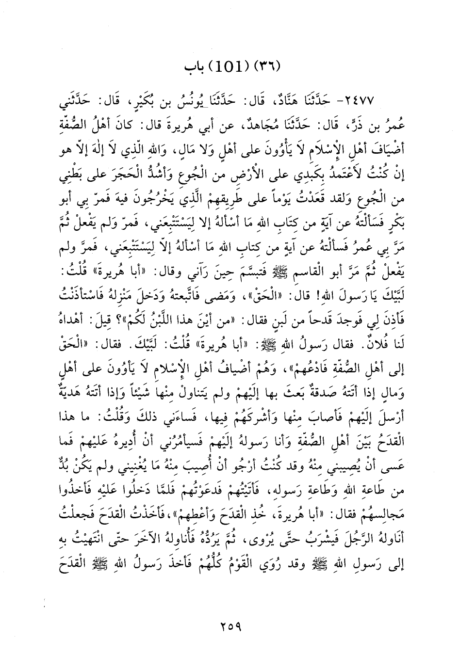 2537 - حَدَّثَنَا سُوَيْدُ بْنُ نَصْرٍ، قَالَ: أَخْبَرَنَا عَبْدُ اللهِ بْنُ الْمُبَارَكِ، قَالَ: أَخْبَرَنَا مَعْمَرٌ، عَنْ هَمَّامِ بْنِ مُنَبِّهٍ، عَنْ أَبِي هُرَيْرَةَ، قَالَ: قَالَ رَسُولُ اللهِ صَلَّى اللَّهُ عَلَيْهِ وَسَلَّمَ: أَوَّلُ زُمْرَةٍ تَلِجُ الجَنَّةَ صُورَتُهُمْ عَلَى صُورَةِ القَمَرِ لَيْلَةَ البَدْرِ لاَ يَبْصُقُونَ فِيهَا وَلاَ يَمْخُطُونَ وَلاَ يَتَغَوَّطُونَ، آنِيَتُهُمْ فِيهَا الذَّهَبُ، وَأَمْشَاطُهُمْ مِنَ الذَّهَبِ وَالفِضَّةِ، وَمَجَامِرُهُمْ مِنَ الأُلُوَّةِ، وَرَشْحُهُمُ الْمِسْكُ، وَلِكُلِّ وَاحِدٍ مِنْهُمْ زَوْجَتَانِ يُرَى مُخُّ سُوقِهِمَا مِنْ وَرَاءِ اللَّحْمِ مِنَ الحُسْنِ لاَ اخْتِلاَفَ بَيْنَهُمْ وَلاَ تَبَاغُضَ، قُلُوبُهُمْ قَلْبُ رَجُلٍ وَاحِدٍ، يُسَبِّحُونَ اللَّهَ بُكْرَةً وَعَشِيًّا.