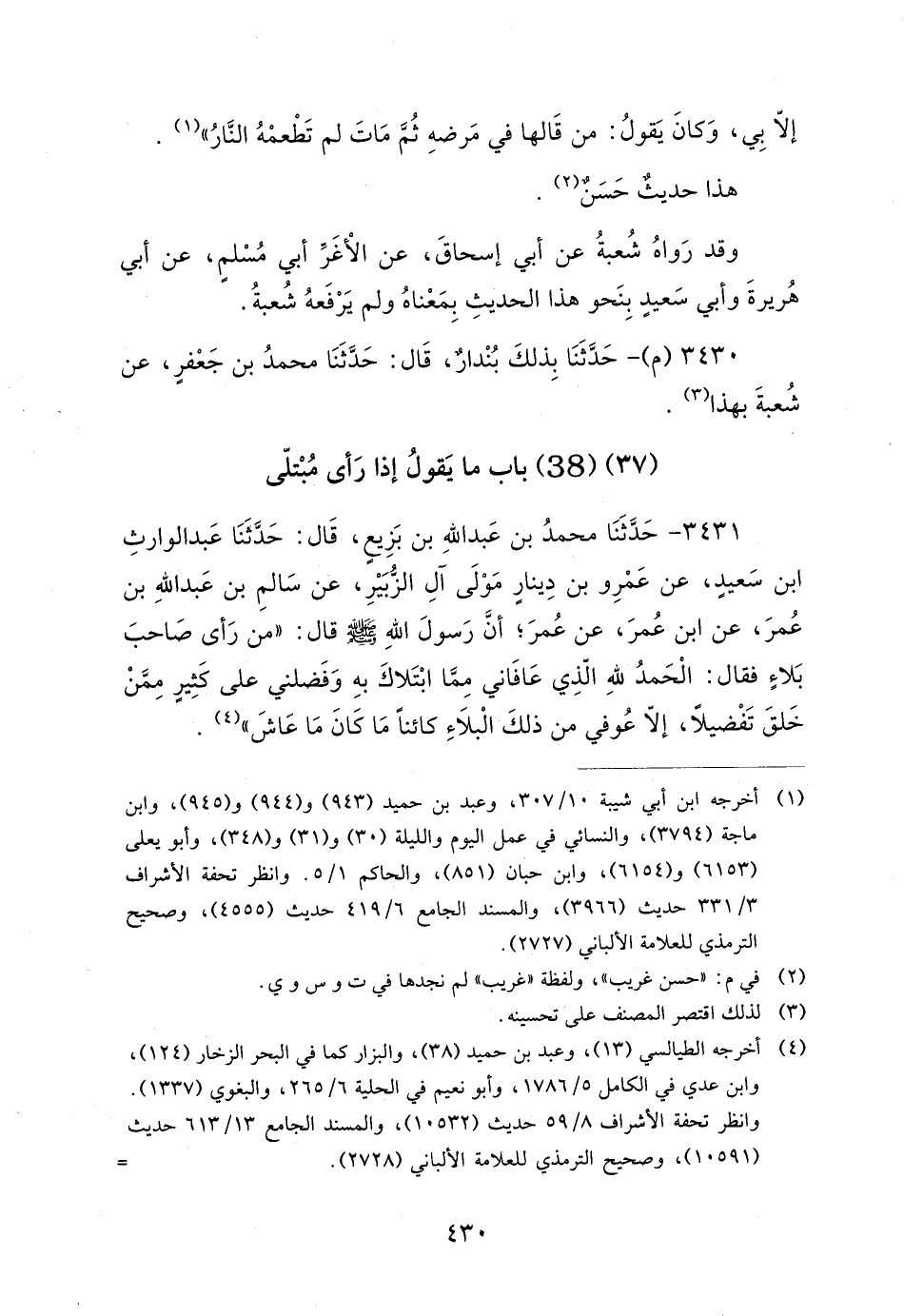 3529 - حَدَّثَنَا الحَسَنُ بْنُ عَرَفَةَ، قَالَ: حَدَّثَنَا إِسْمَاعِيلُ بْنُ عَيَّاشٍ، عَنْ مُحَمَّدِ بْنِ زِيَادٍ، عَنْ أَبِي رَاشِدٍ الحُبْرَانِيِّ، قَالَ: أَتَيْتُ عَبْدَ اللهِ بْنَ عَمْرِو بْنِ العَاصِ، فَقُلْتُ لَهُ: حَدِّثْنَا مِمَّا سَمِعْتَ مِنْ رَسُولِ اللهِ صَلَّى اللَّهُ عَلَيْهِ وَسَلَّمَ، فَأَلْقَى إِلَيَّ صَحِيفَةً، فَقَالَ: هَذَا مَا كَتَبَ لِي رَسُولُ اللهِ صَلَّى اللَّهُ عَلَيْهِ وَسَلَّمَ، قَالَ: فَنَظَرْتُ فِيهَا فَإِذَا فِيهَا: إِنَّ أَبَا بَكْرٍ الصِّدِّيقَ قَالَ: يَا رَسُولَ اللهِ عَلِّمْنِي مَا أَقُولُ إِذَا أَصْبَحْتُ وَإِذَا أَمْسَيْتُ، فَقَالَ: يَا أَبَا بَكْرٍ قُلْ: اللَّهُمَّ فَاطِرَ السَّمَوَاتِ وَالأَرْضِ عَالِمَ الغَيْبِ وَالشَّهَادَةِ لاَ إِلَهَ إِلاَّ أَنْتَ رَبَّ كُلِّ شَيْءٍ وَمَلِيكَهُ، أَعُوذُ بِكَ مِنْ شَرِّ نَفْسِي، وَمِنْ شَرِّ الشَّيْطَانِ وَشِرْكِهِ، وَأَنْ أَقْتَرِفَ عَلَى نَفْسِي سُوءًا أَوْ أَجُرَّهُ إِلَى مُسْلِمٍ.