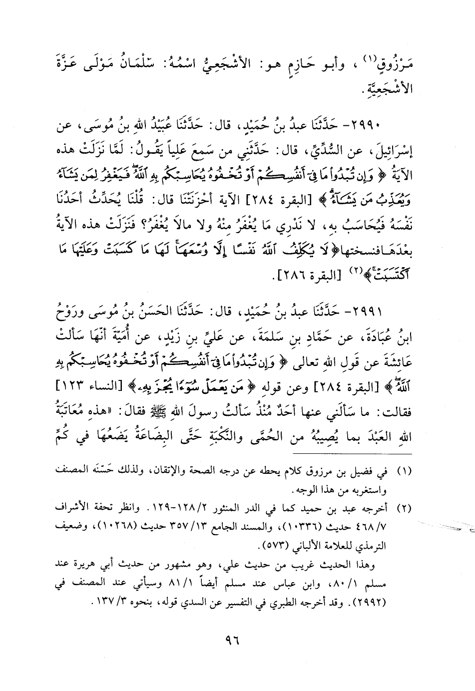 ، قَالَ: فَرَجَعْتُ، وَلَوَدِدْتُ أَنِّي خَرَجْتُ مِنْ بَعْضِ مَالِي وَلَمْ أُكَلِّمْ رَسُولَ اللهِ صَلَّى اللَّهُ عَلَيْهِ وَسَلَّمَ فِي ذَلِكَ، فَأَتَانِي عَمِّي رِفَاعَةُ فَقَالَ: يَا ابْنَ أَخِي مَا صَنَعْتَ؟ فَأَخْبَرْتُهُ بِمَا قَالَ لِي رَسُولُ اللهِ صَلَّى اللَّهُ عَلَيْهِ وَسَلَّمَ، فَقَالَ: اللَّهُ الْمُسْتَعَانُ، فَلَمْ يَلْبَثْ أَنْ نَزَلَ القُرْآنُ {إِنَّا أَنْزَلْنَا إِلَيْكَ الكِتَابَ بِالحَقِّ لِتَحْكُمَ بَيْنَ النَّاسِ بِمَا أَرَاكَ اللَّهُ وَلاَ تَكُنْ لِلْخَائِنِينَ خَصِيمًا} بَنِي أُبَيْرِقٍ {وَاسْتَغْفِرِ اللَّهَ} أَيْ مِمَّا قُلْتَ لِقَتَادَةَ {إِنَّ اللَّهَ كَانَ غَفُورًا رَحِيمًا} {وَلاَ تُجَادِلْ عَنِ الَّذِينَ يَخْتَانُونَ أَنْفُسَهُمْ إِنَّ اللَّهَ لاَ يُحِبُّ مَنْ كَانَ خَوَّانًا أَثِيمًا يَسْتَخْفُونَ مِنَ النَّاسِ وَلاَ يَسْتَخْفُونَ مِنَ اللهِ وَهُوَ مَعَهُمْ}، إِلَى قَوْلِهِ: {غَفُورًا رَحِيمًا} أَيْ: لَوْ اسْتَغْفَرُوا اللَّهَ لَغَفَرَ لَهُمْ {وَمَنْ يَكْسِبْ إِثْمًا فَإِنَّمَا يَكْسِبُهُ عَلَى نَفْسِهِ}، إِلَى قَوْلِهِ: {وَإِثْمًا مُبِينًا} قَوْلَهُمْ لِلَبِيدٍ {وَلَوْلاَ فَضْلُ اللهِ عَلَيْكَ وَرَحْمَتُهُ}، إِلَى قَوْلِهِ: {فَسَوْفَ نُؤْتِيهِ أَجْرًا عَظِيمًا} فَلَمَّا نَزَلَ القُرْآنُ أَتَى رَسُولُ اللهِ صَلَّى اللَّهُ عَلَيْهِ وَسَلَّمَ بِالسِّلاَحِ فَرَدَّهُ إِلَى رِفَاعَةَ، فَقَالَ قَتَادَةُ: لَمَّا أَتَيْتُ عَمِّي بِالسِّلاَحِ، وَكَانَ شَيْخًا قَدْ عَشَا، أَوْ عَسَا، فِي الجَاهِلِيَّةِ، وَكُنْتُ أُرَى إِسْلاَمُهُ مَدْخُولاً، فَلَمَّا أَتَيْتُهُ بِالسِّلاَحِ قَالَ: يَا ابْنَ أَخِي، هُوَ فِي سَبِيلِ اللهِ، فَعَرَفْتُ أَنَّ إِسْلاَمَهُ كَانَ صَحِيحًا، فَلَمَّا نَزَلَ القُرْآنُ لَحِقَ بُشَيْرٌ بِالمُشْرِكِينَ، فَنَزَلَ عَلَى سُلاَفَةَ بِنْتِ سَعْدِ ابْنِ سُمَيَّةَ فَأَنْزَلَ اللَّهُ {وَمَنْ يُشَاقِقِ الرَّسُولَ مِنْ بَعْدِ مَا تَبَيَّنَ لَهُ الهُدَى وَيَتَّبِعْ غَيْرَ سَبِيلِ الْمُؤْمِنِينَ نُوَلِّهِ مَا تَوَلَّى وَنُصْلِهِ جَهَنَّمَ وَسَاءَتْ مَصِيرًا إِنَّ اللَّهَ لاَ يَغْفِرُ أَنْ يُشْرَكَ بِهِ وَيَغْفِرُ مَا دُونَ ذَلِكَ لِمَنْ يَشَاءُ وَمَنْ يُشْرِكْ بِاللَّهِ فَقَدْ ضَلَّ ضَلاَلاً بَعِيدًا}
