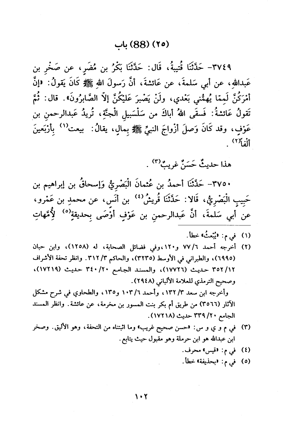 3748 - حَدَّثَنَا صَالِحُ بْنُ مِسْمَارٍ الْمَرْوَزِيُّ، قَالَ: حَدَّثَنَا ابْنُ أَبِي فُدَيْكٍ، عَنْ مُوسَى بْنِ يَعْقُوبَ، عَنْ عُمَرَ بْنِ سَعِيدٍ، عَنْ عَبْدِ الرَّحْمَنِ بْنِ حُمَيْدٍ، عَنْ أَبِيهِ، أَنَّ سَعِيدَ بْنَ زَيْدٍ، حَدَّثَهُ فِي نَفَرٍ، أَنَّ رَسُولَ اللهِ صَلَّى اللَّهُ عَلَيْهِ وَسَلَّمَ قَالَ: عَشَرَةٌ فِي الجَنَّةِ: أَبُو بَكْرٍ فِي الجَنَّةِ، وَعُمَرُ فِي الجَنَّةِ، وَعُثْمَانُ وَعَلِيٌّ وَالزُّبَيْرُ وَطَلْحَةُ وَعَبْدُ الرَّحْمَنِ وَأَبُو عُبَيْدَةَ وَسَعْدُ بْنُ أَبِي وَقَّاصٍ. قَالَ: فَعَدَّ هَؤُلاَءِ التِّسْعَةَ وَسَكَتَ عَنِ العَاشِرِ، فَقَالَ القَوْمُ: نَنْشُدُكَ اللَّهَ يَا أَبَا الأَعْوَرِ مَنِ العَاشِرُ؟ قَالَ: نَشَدْتُمُونِي بِاللَّهِ، أَبُو الأَعْوَرِ فِي الجَنَّةِ.