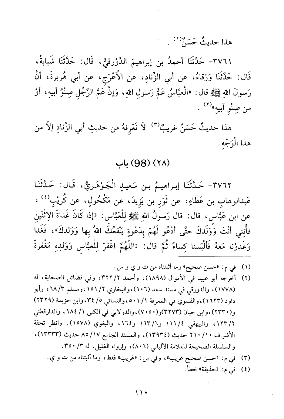 3758 - حَدَّثَنَا قُتَيْبَةُ، قَالَ: حَدَّثَنَا أَبُو عَوَانَةَ، عَنْ يَزِيدَ بْنِ أَبِي زِيَادٍ، عَنْ عَبْدِ اللهِ بْنِ الْحَارِثِ قَالَ: حَدَّثَنِي عَبْدُ الْمُطَّلِبِ بْنُ رَبِيعَةَ بْنِ الحَارِثِ بْنِ عَبْدِ الْمُطَّلِبِ، أَنَّ العَبَّاسَ بْنَ عَبْدِ الْمُطَّلِبِ، دَخَلَ عَلَى رَسُولِ اللهِ صَلَّى اللَّهُ عَلَيْهِ وَسَلَّمَ مُغْضَبًا وَأَنَا عِنْدَهُ، فَقَالَ: مَا أَغْضَبَكَ؟ قَالَ: يَا رَسُولَ اللهِ مَا لَنَا وَلِقُرَيْشٍ، إِذَا تَلاَقَوْا بَيْنَهُمْ تَلاَقَوْا بِوُجُوهٍ مُبْشَرَةٍ، وَإِذَا لَقُونَا لَقُونَا بِغَيْرِ ذَلِكَ، قَالَ: فَغَضِبَ رَسُولُ اللهِ صَلَّى اللَّهُ عَلَيْهِ وَسَلَّمَ حَتَّى احْمَرَّ وَجْهُهُ، ثُمَّ قَالَ: وَالَّذِي نَفْسِي بِيَدِهِ لاَ يَدْخُلُ قَلْبَ رَجُلٍ الإِيمَانُ حَتَّى يُحِبَّكُمْ لِلَّهِ وَلِرَسُولِهِ، ثُمَّ قَالَ: يَا أَيُّهَا النَّاسُ مَنْ آذَى عَمِّي فَقَدْ آذَانِي فَإِنَّمَا عَمُّ الرَّجُلِ صِنْوُ أَبِيهِ.