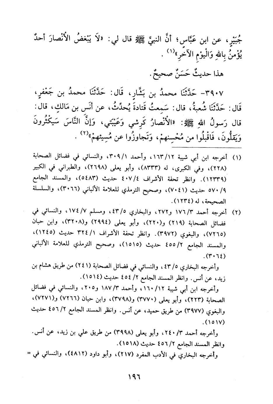 3901 - حَدَّثَنَا مُحَمَّدُ بْنُ بَشَّارٍ، قَالَ: حَدَّثَنَا مُحَمَّدُ بْنُ جَعْفَرٍ، قَالَ: حَدَّثَنَا شُعْبَةُ، قَالَ: سَمِعْتُ قَتَادَةَ، عَنْ أَنَسٍ قَالَ: جَمَعَ رَسُولُ اللهِ صَلَّى اللَّهُ عَلَيْهِ وَسَلَّمَ نَاسًا مِنَ الأَنْصَارِ فَقَالَ: هَلْ فِيكُمْ أَحَدٌ مِنْ غَيْرِكُمْ؟ قَالُوا: لاَ، إِلاَّ ابْنَ أُخْتٍ لَنَا، فَقَالَ صَلَّى اللَّهُ عَلَيْهِ وَسَلَّمَ: إِنَّ ابْنَ أُخْتِ القَوْمِ مِنْهُمْ، ثُمَّ قَالَ: إِنَّ قُرَيْشًا حَدِيثٌ عَهْدُهُمْ بِجَاهِلِيَّةٍ وَمُصِيبَةٍ، وَإِنِّي أَرَدْتُ أَنْ أَجْبُرَهُمْ وَأَتَأَلَّفَهُمْ، أَمَا تَرْضَوْنَ أَنْ يَرْجِعَ النَّاسُ بِالدُّنْيَا وَتَرْجِعُونَ بِرَسُولِ اللهِ إِلَى بُيُوتِكُمْ؟ قَالُوا: بَلَى، فَقَالَ رَسُولُ اللهِ صَلَّى اللَّهُ عَلَيْهِ وَسَلَّمَ: لَوْ سَلَكَ النَّاسُ وَادِيًا أَوْ شِعْبًا وَسَلَكَتِ الأَنْصَارُ وَادِيًا أَوْ شِعْبًا لَسَلَكْتُ وَادِيَ الأَنْصَارِ أَوْ شِعْبَهُمْ.