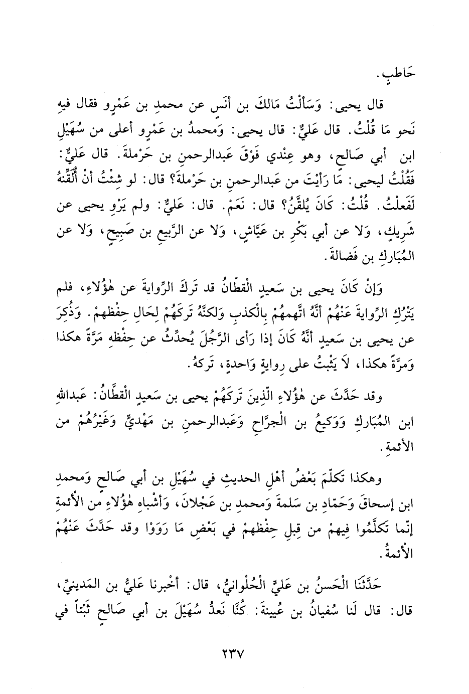 وإنما فعل هذا أحمد بن حنبل لانه لم يصدق هذا عن النبي صلى الله عليه وسلم لضعف إسناده لانه لم يعرفه عن النبي صلى الله عليه وسلم، والحجاج بن نصير يضعف في الحديث، وعبد الله بن سعيد الْمقبرى ضعفه يحيى بن سعيد القطان جدا في الحديث، فكل من روى عنه حديث ممن يتهم أو يضعف لغفلته وكثرة خطئه ولا يعرف ذلك الحديث إلا من حديثه فلا يحتج به. وقد روى غير واحد من الائمة عن الضعفاء وبينوا أحوالهم للناس. 4057 حدثنا أبراهيم بن عبد الله بن منذر الباهلى، أخبرنا يعلى بن عبيد قال قال لنا سفيان الثوري اتقوا الكلبى. فقيل له لانك تروى عنه. قال أنا أعرف صدقه من كذبه. وأخبرني محمد بن إسماعيل حدثنى يحيى بن معين حدثنى عفان عن أبى عوانة قال لما مات الحسن البصري اشتهيت كلامه فتتبعته عن أصحاب الحسن فأنيت به أبان بن أبى عياش فقرأ على كله عن الحسن فما أستحل أن أروى عنه شيئا.