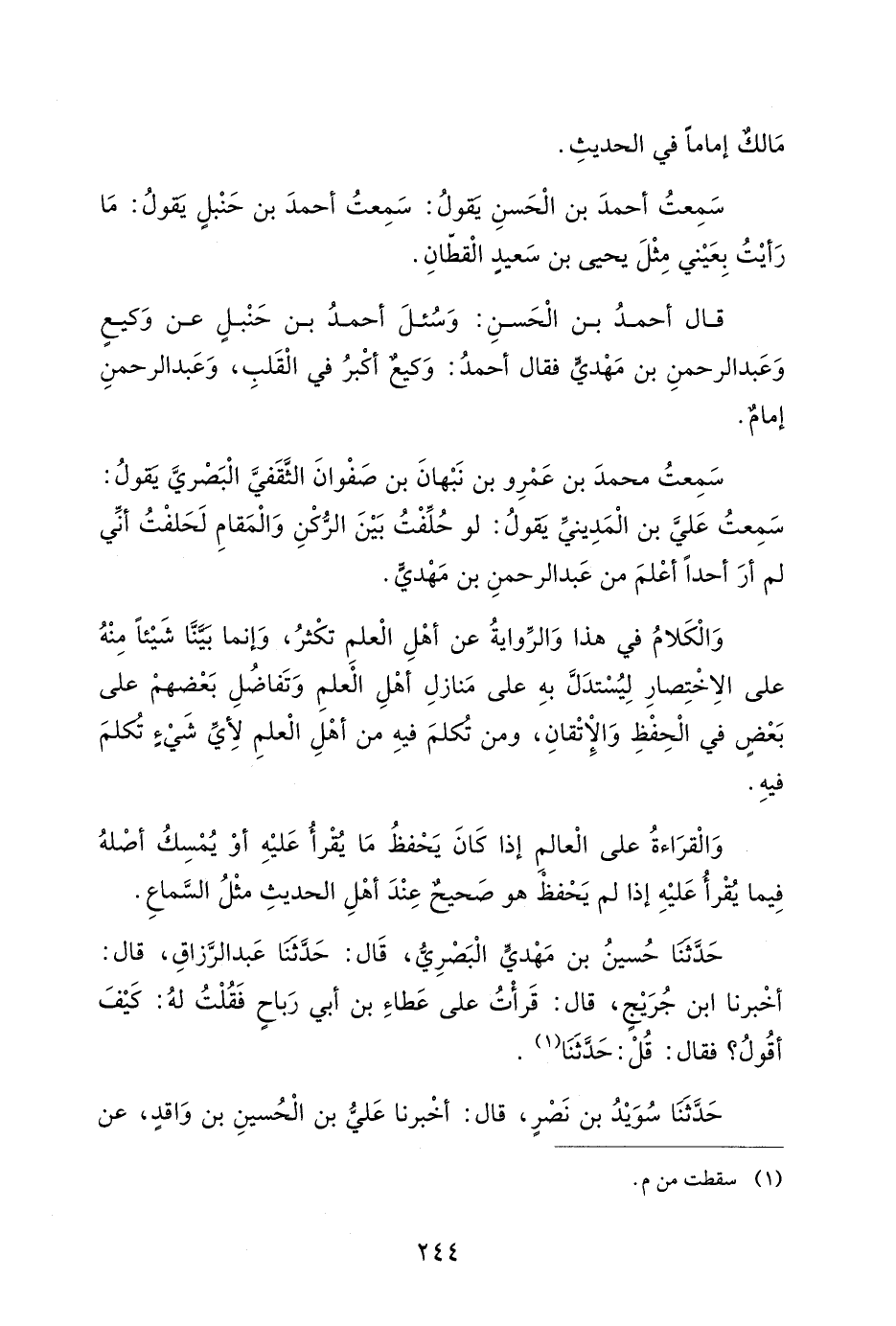 حدثنا أبو حفص عمرو بن على، أخبرنا يحيى بن سعيد القطان عن سفيان عن منصور، قال قلت لابراهيم: مالسالم بن أبى الجعد أتم حديثا منك؟ قال: لانه كان يكتب، حدثنا عبد الجبار بن العلاء بن عبد الجبار، أخبرنا سفيان، قال: قال عبد الْملك بن عمير إنى لاحدث بالحديث فما أدع منه حرفا.