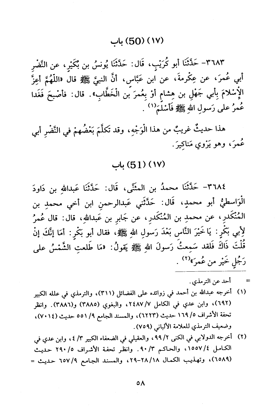3681 - حَدَّثَنَا مُحَمَّدُ بْنُ بَشَّارٍ، وَمُحَمَّدُ بْنُ رَافِعٍ، قَالاَ: حَدَّثَنَا أَبُو عَامِرٍ العَقَدِيُّ، قَالَ: حَدَّثَنَا خَارِجَةُ بْنُ عَبْدِ اللهِ الأَنْصَارِيُّ، عَنْ نَافِعٍ، عَنِ ابْنِ عُمَرَ، أَنَّ رَسُولَ اللهِ صَلَّى اللَّهُ عَلَيْهِ وَسَلَّمَ قَالَ: اللَّهُمَّ أَعِزَّ الإِسْلاَمَ بِأَحَبِّ هَذَيْنِ الرَّجُلَيْنِ إِلَيْكَ بِأَبِي جَهْلٍ أَوْ بِعُمَرَ بْنِ الخَطَّابِ قَالَ: وَكَانَ أَحَبَّهُمَا إِلَيْهِ عُمَرُ.